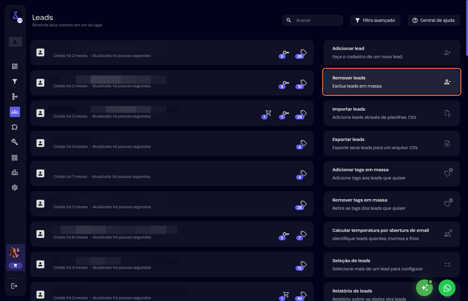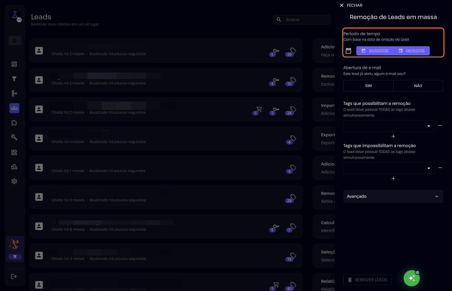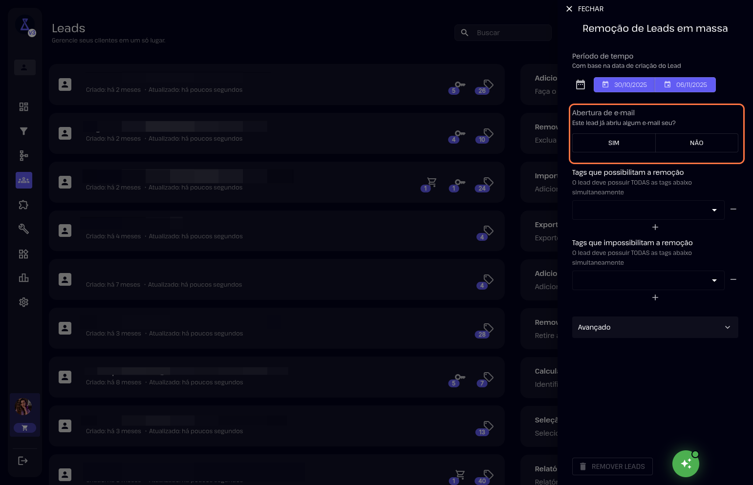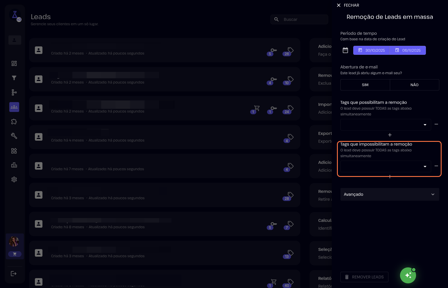5- Também pode filtrar por tags que possibilitam a remoção dos leads.
