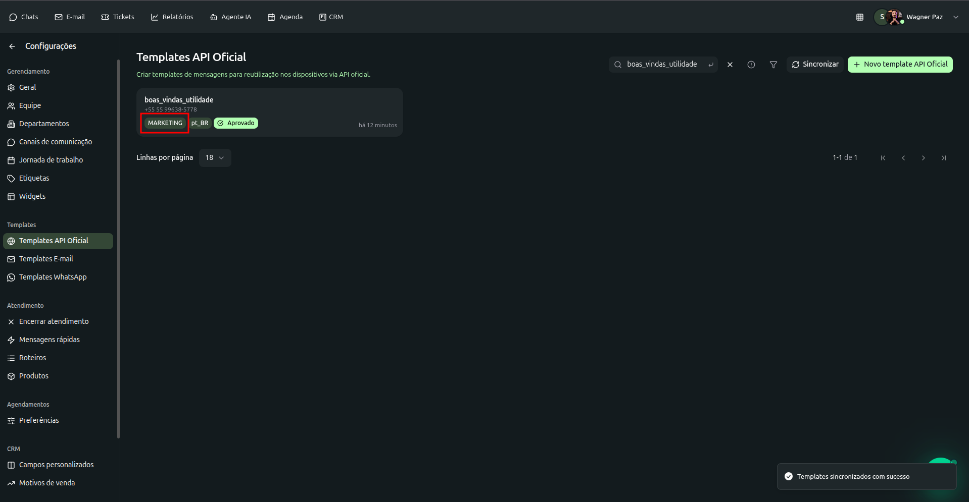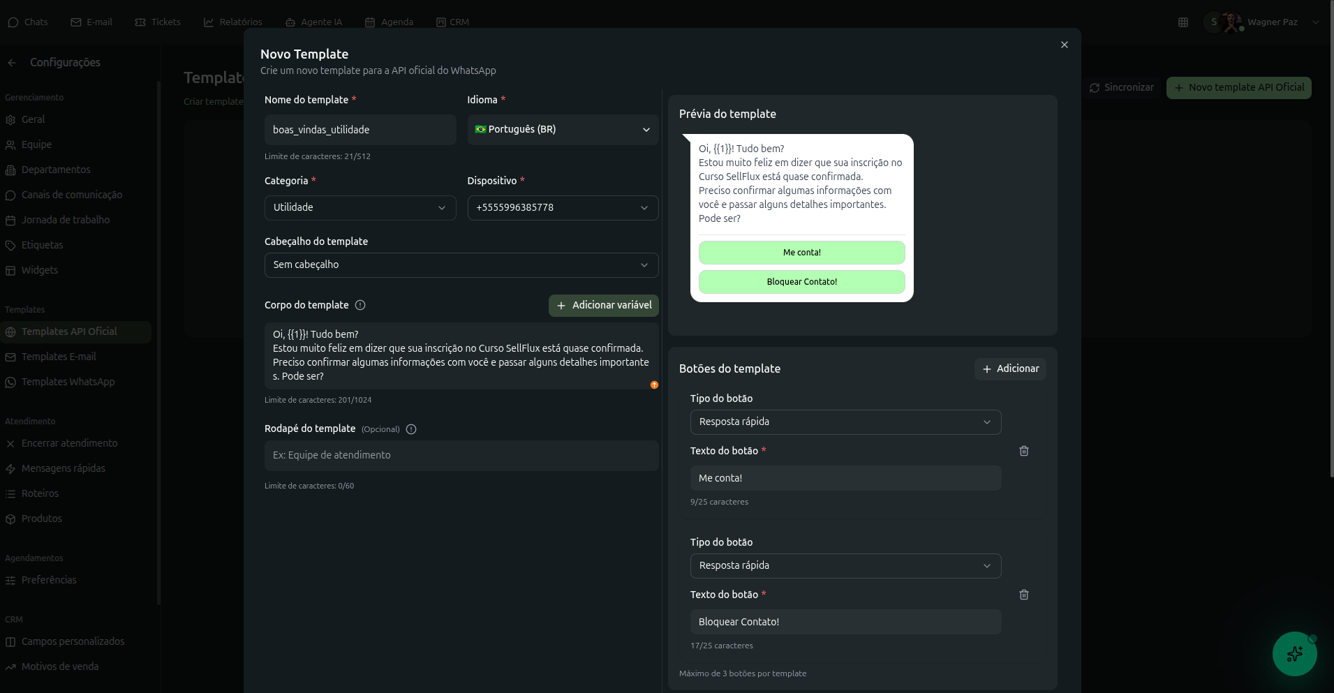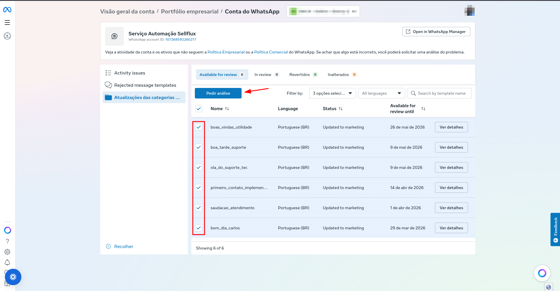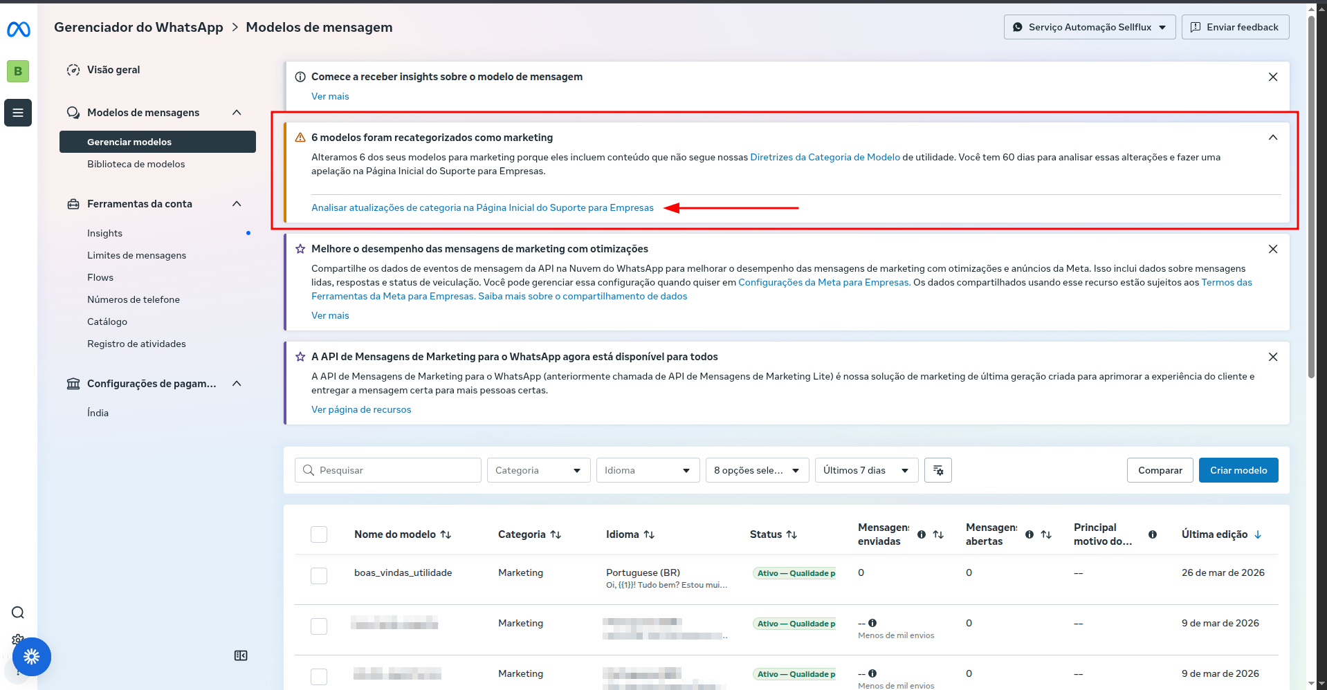 É comum que o Meta altere automaticamente a categoria de um template de "Utilidade" para "Marketing" durante ou após a aprovação. Se isso acontecer na sua conta gerida via SellFlux, siga os seguintes passos: