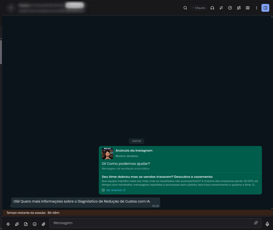 A IA ganha contexto desde o primeiro contato, conseguindo responder com mais precisão, personalizar abordagens e conduzir o lead com muito mais eficiência, sem depender de múltiplas perguntas iniciais. Isso reduz tempo, custo e aumenta a qualidade das interações.