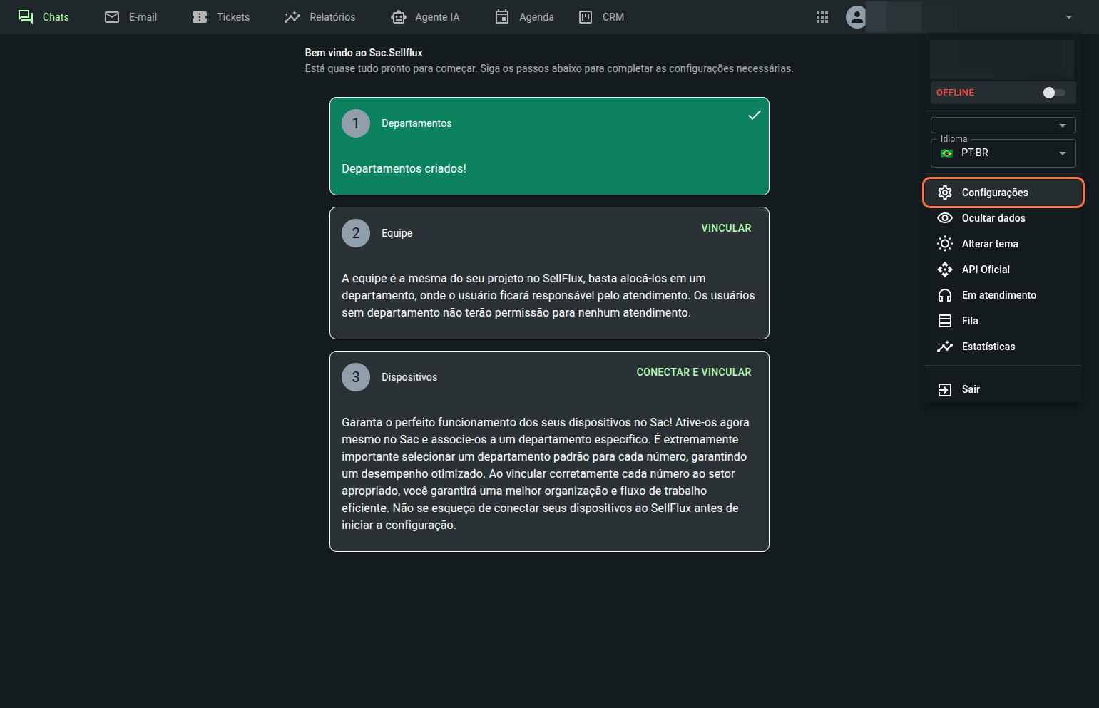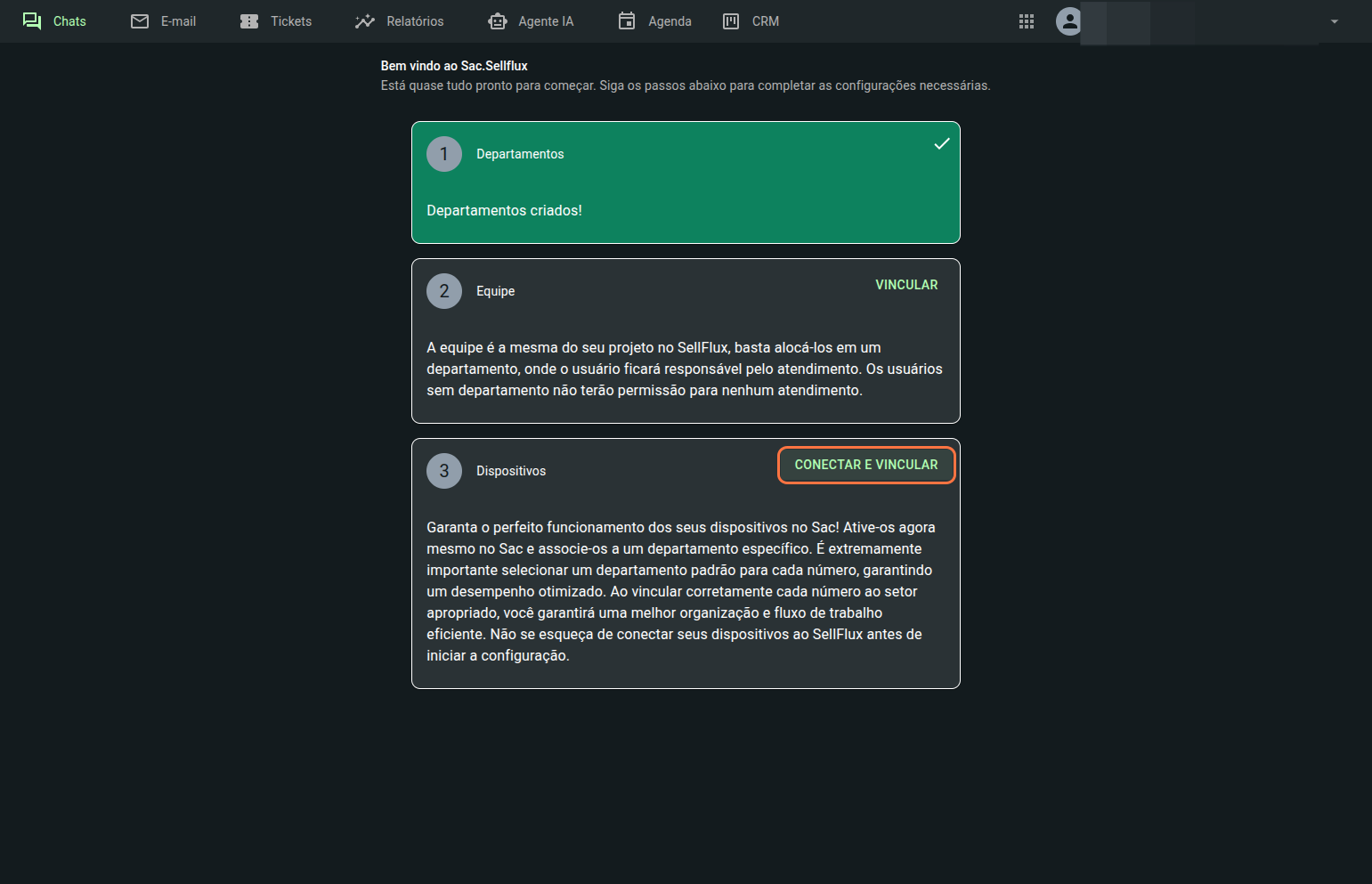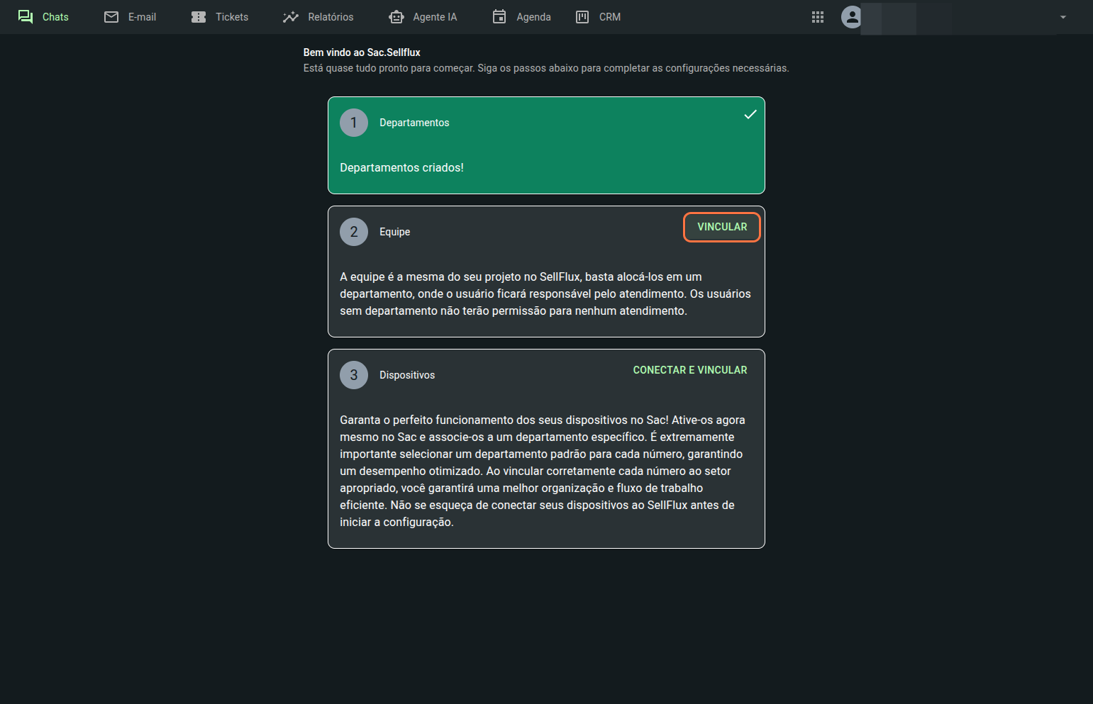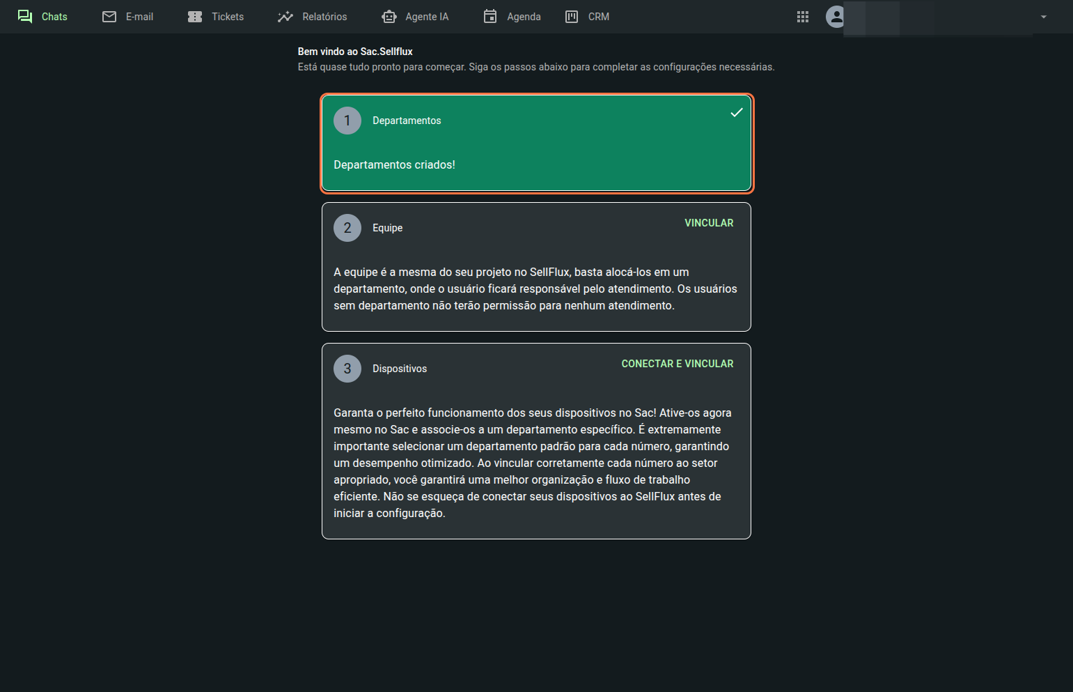 Como o SAC ainda não foi configurado, a tela inicial será essa. Mostrando as configurações que precisa realizar para o SAC funcionar. O departamento virá em verde, pois o sistema por padrão já cria o departamento default.