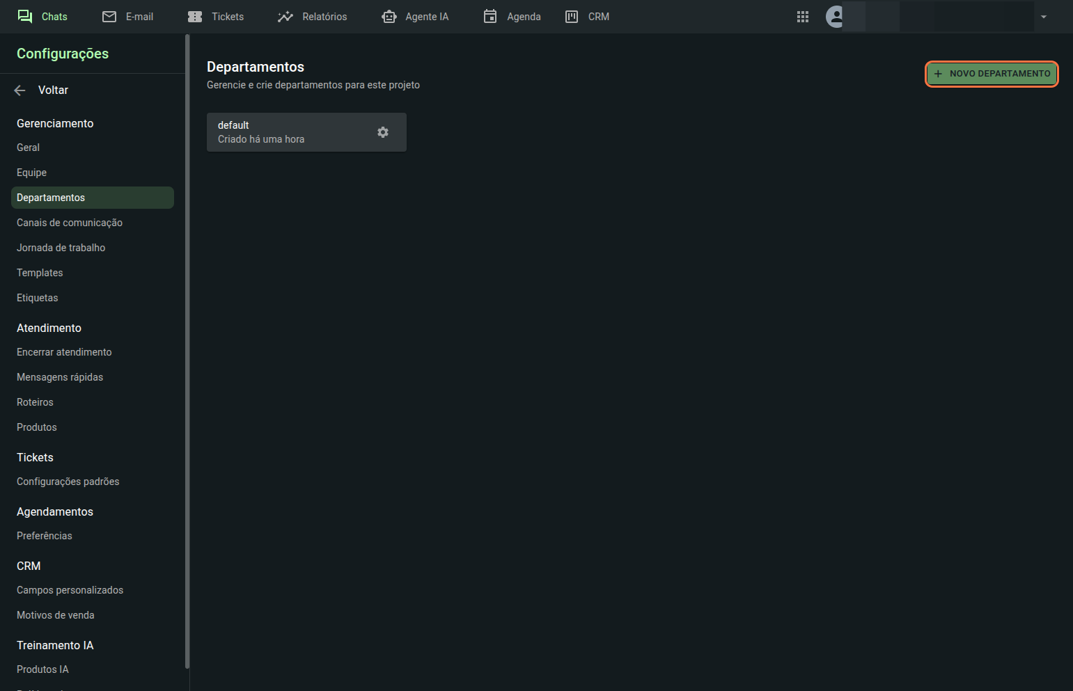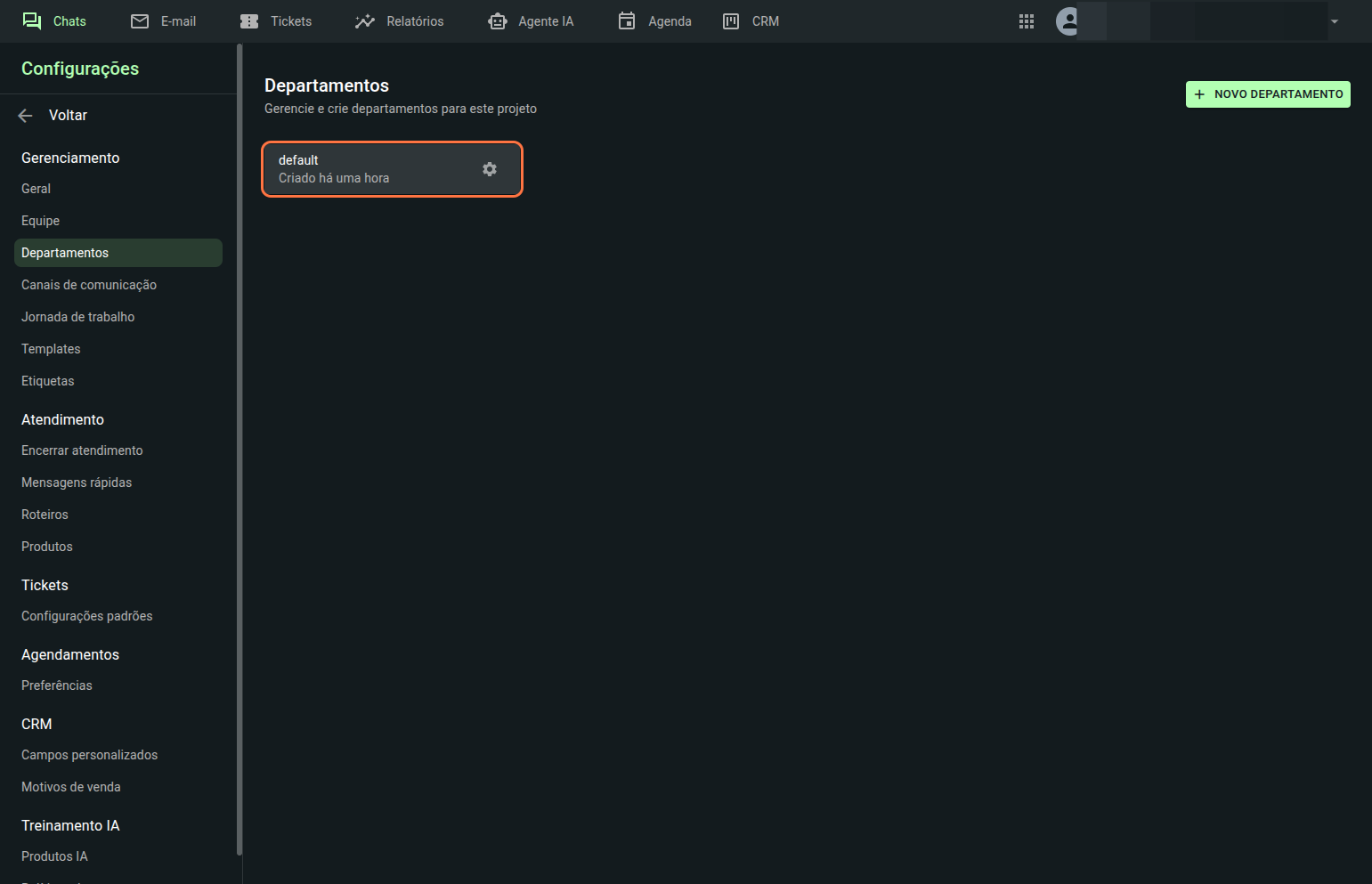 Sem um departamento atribuído, o usuário não receberá nem conseguirá visualizar os atendimentos.