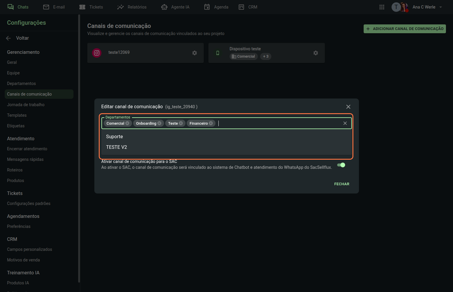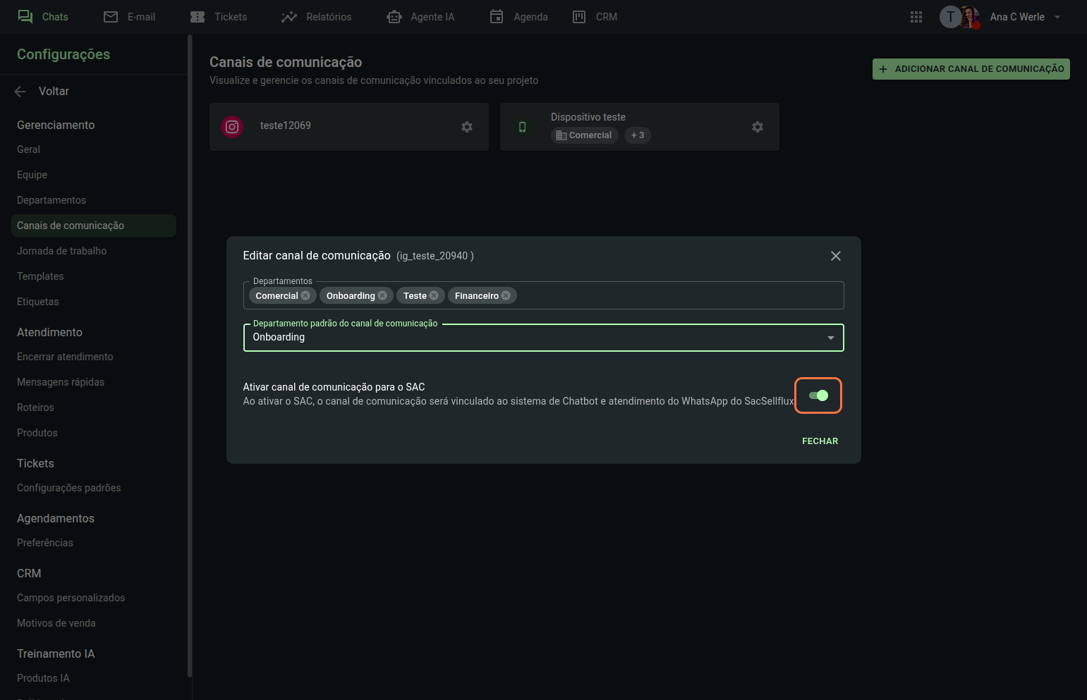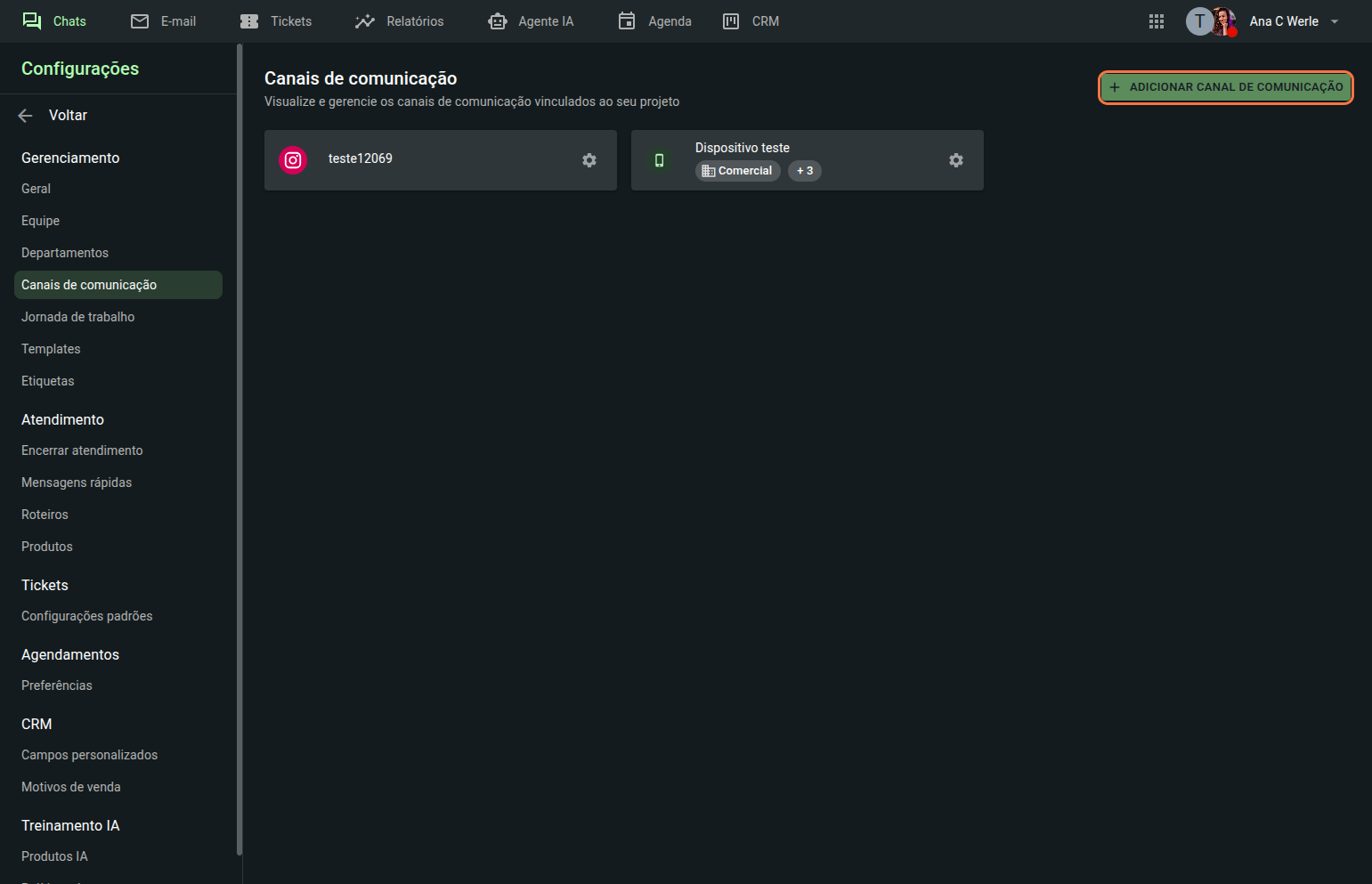 Ao clicar nesse botão, será automaticamente redirecionado para a aba "Canais de comunicação" que fica nas configurações do SAC.