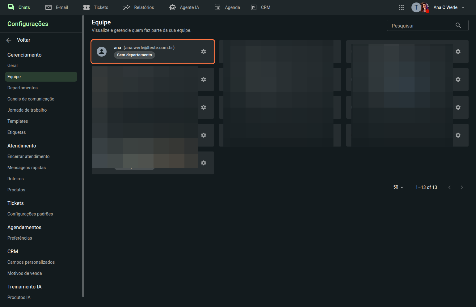 Automaticamente será redirecionado a aba "equipe" que fica nas configurações do SAC.