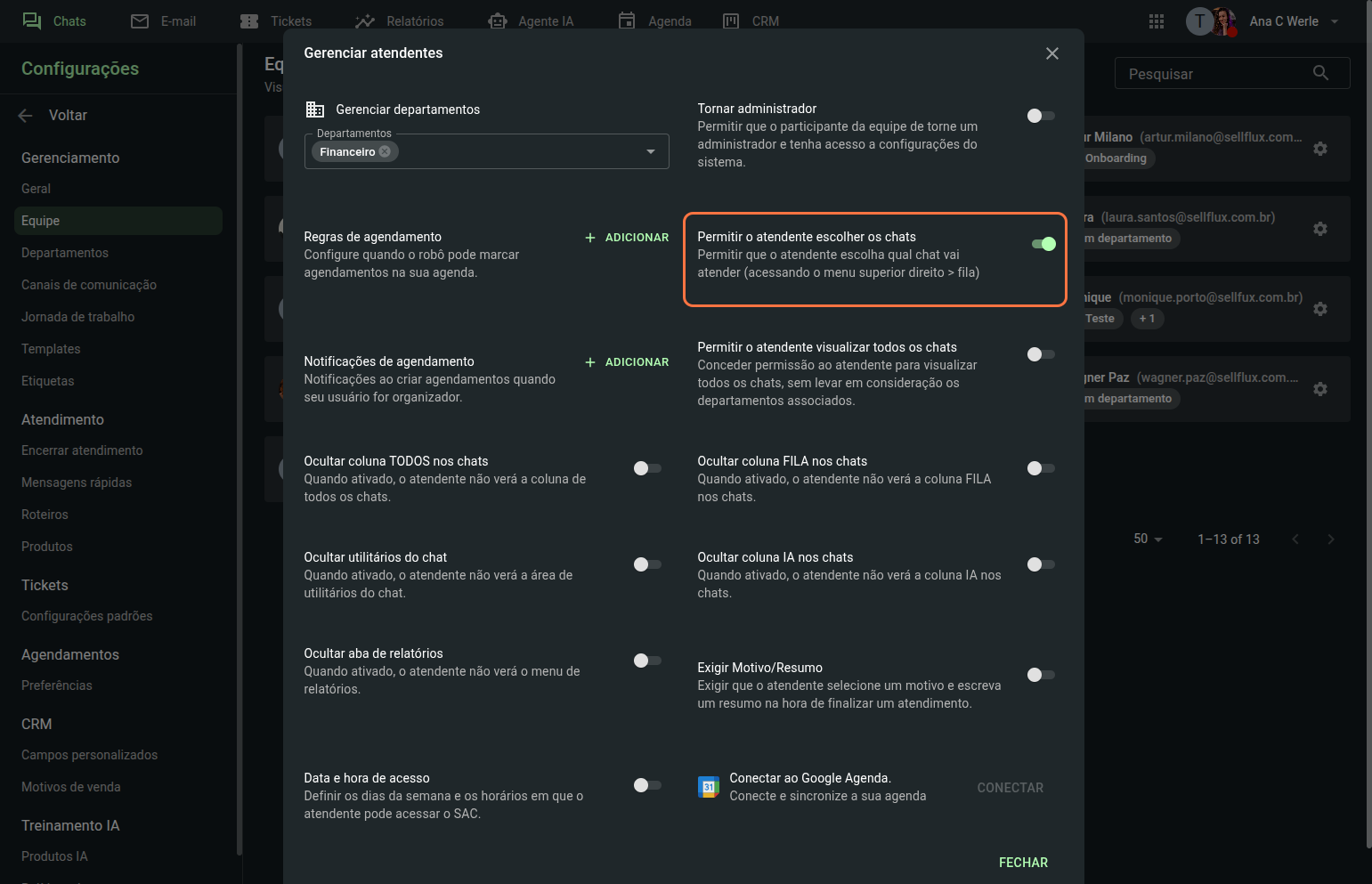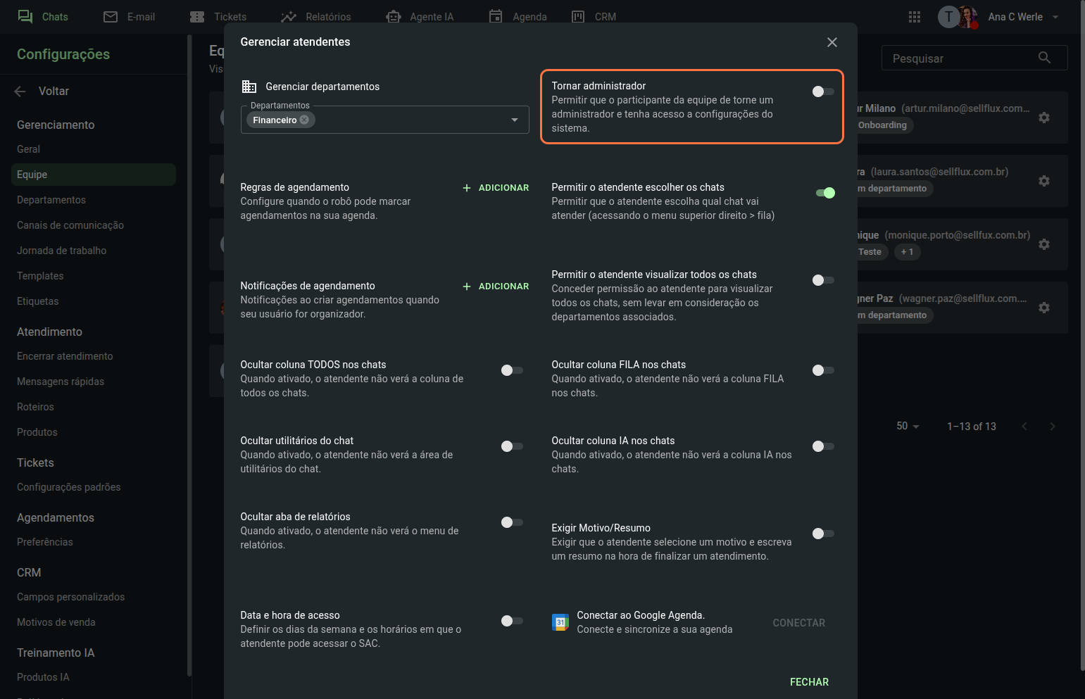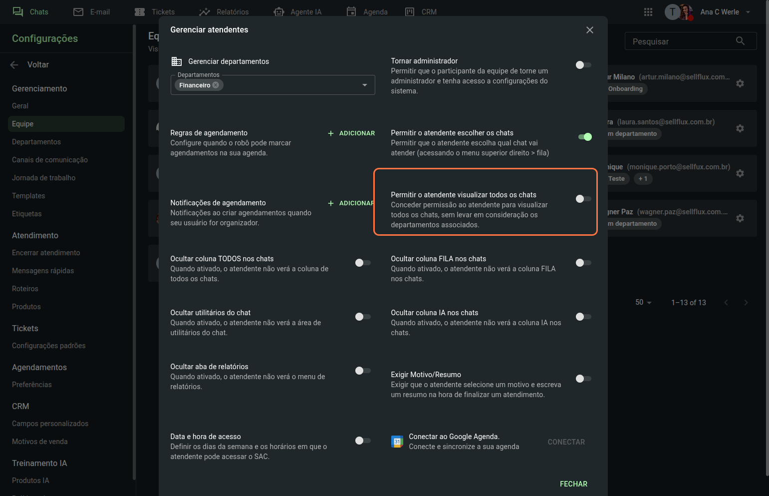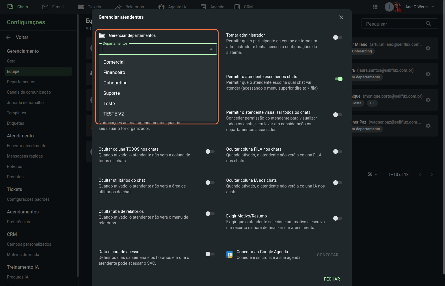 Clique sobre um dos membros da equipe para configurar o departamento ao qual esse atendente poderá visualizar e responder às mensagens, e também suas permissões no SAC.