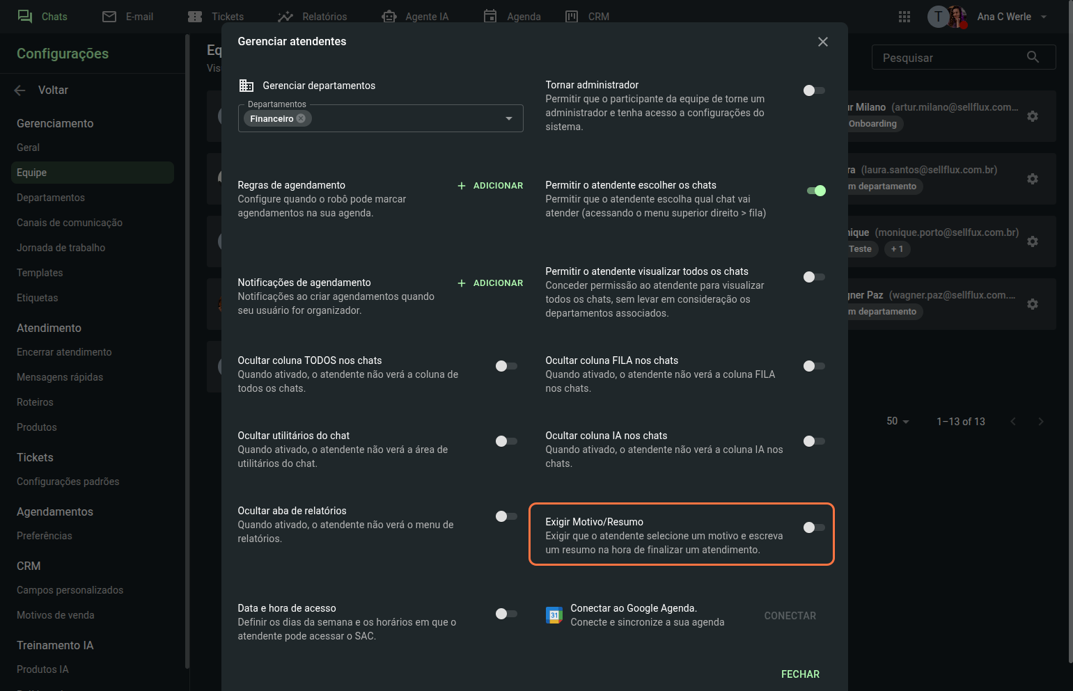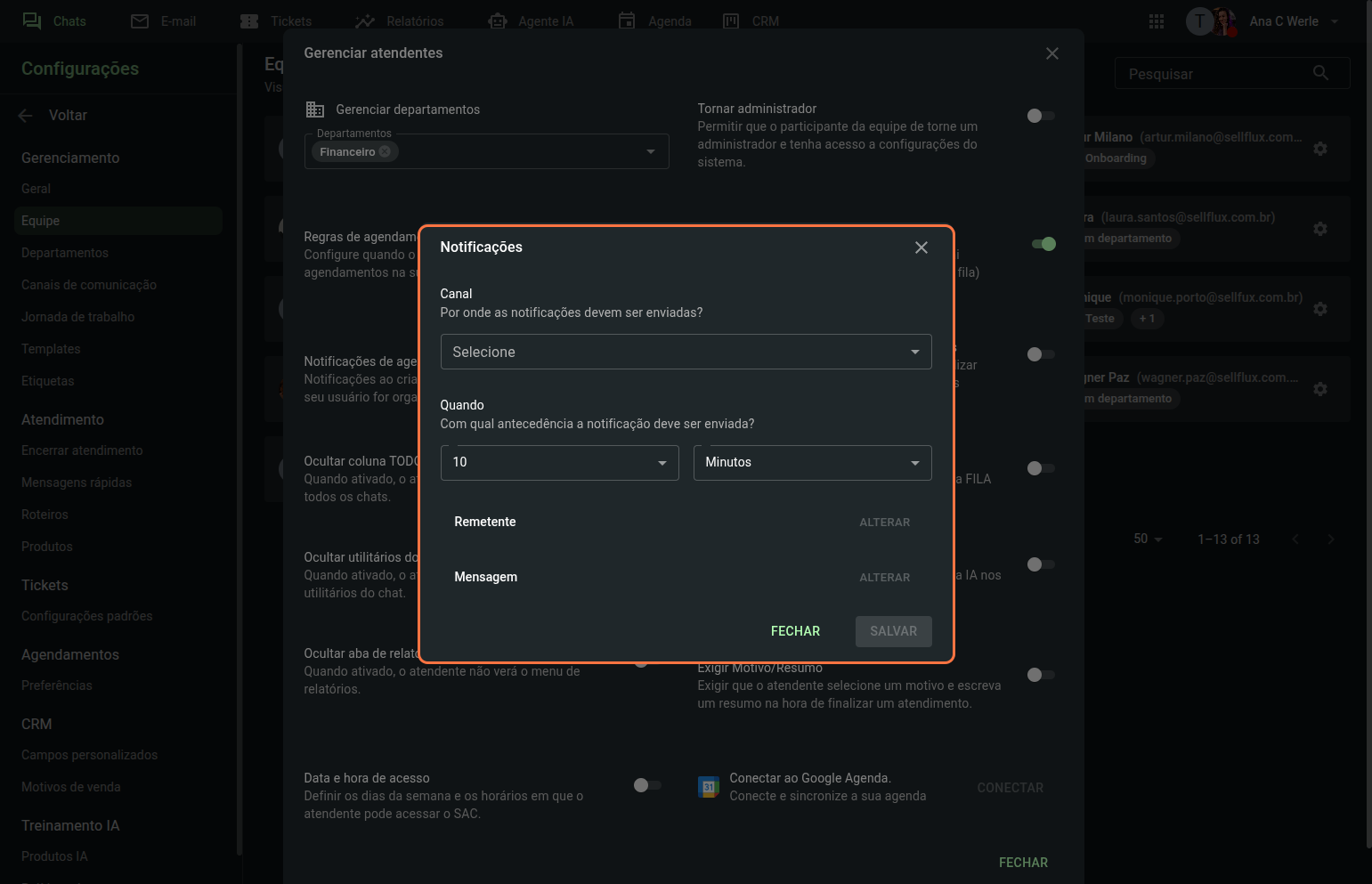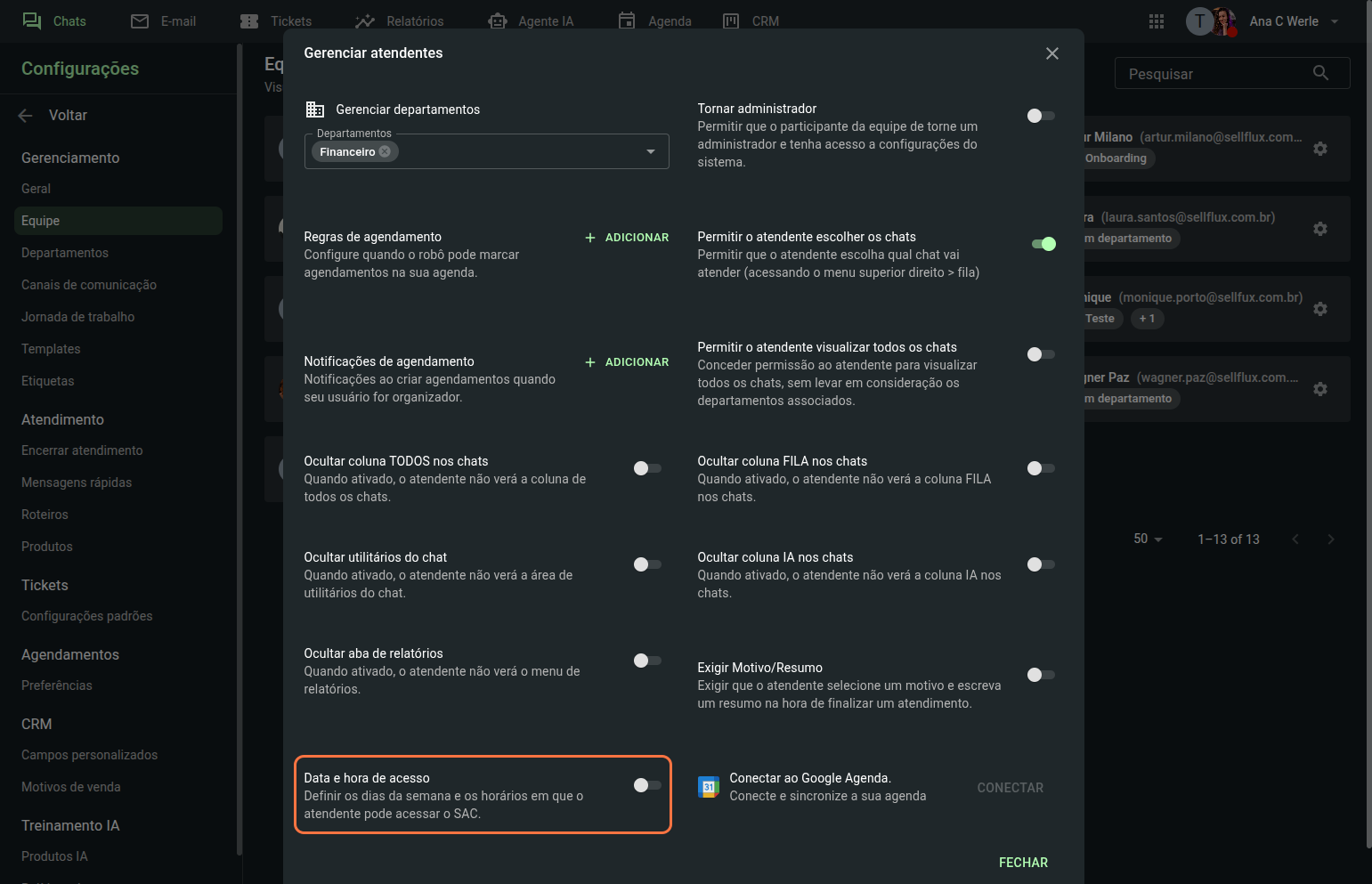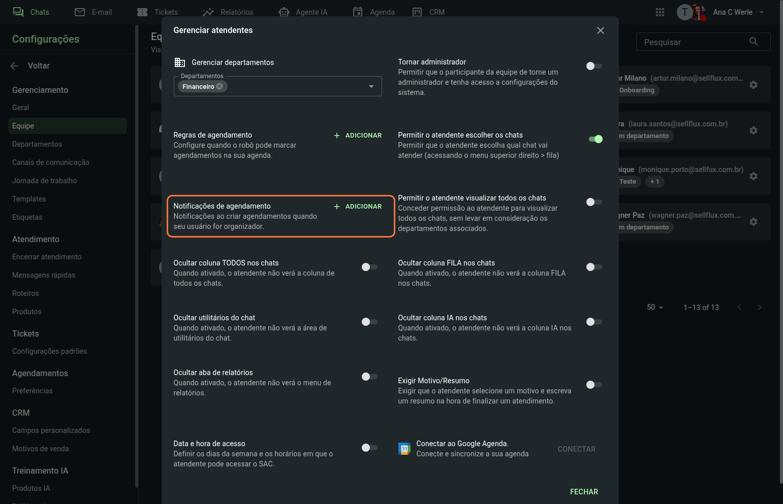 Clique sobre um dos membros da equipe para configurar o departamento ao qual esse atendente poderá visualizar e responder às mensagens, e também suas permissões no SAC.