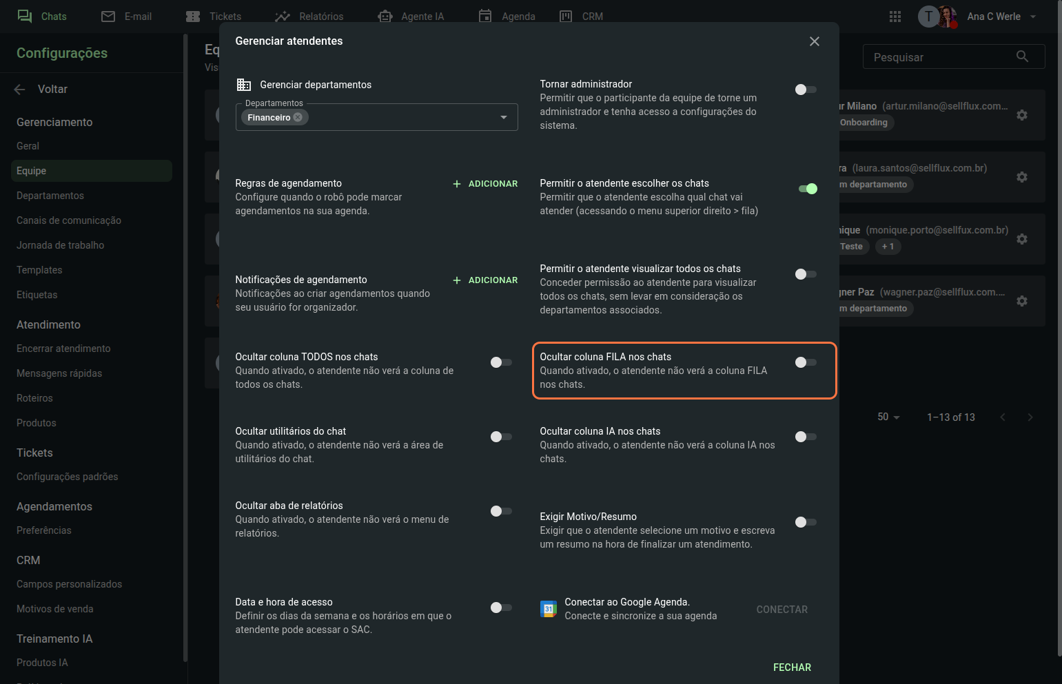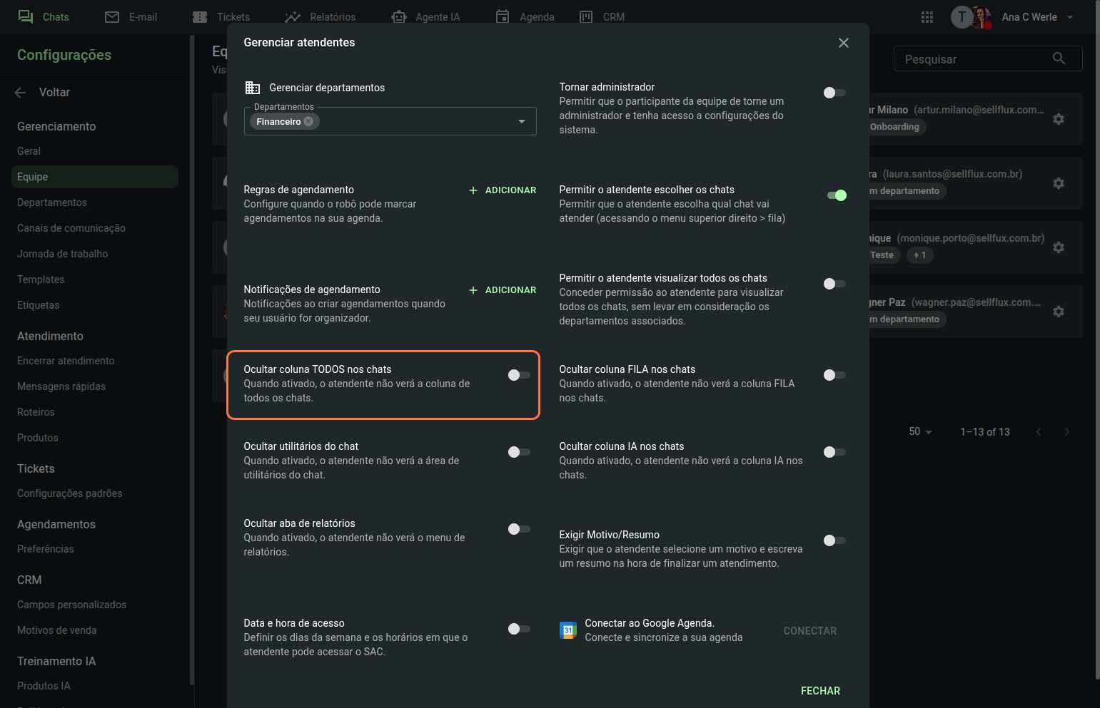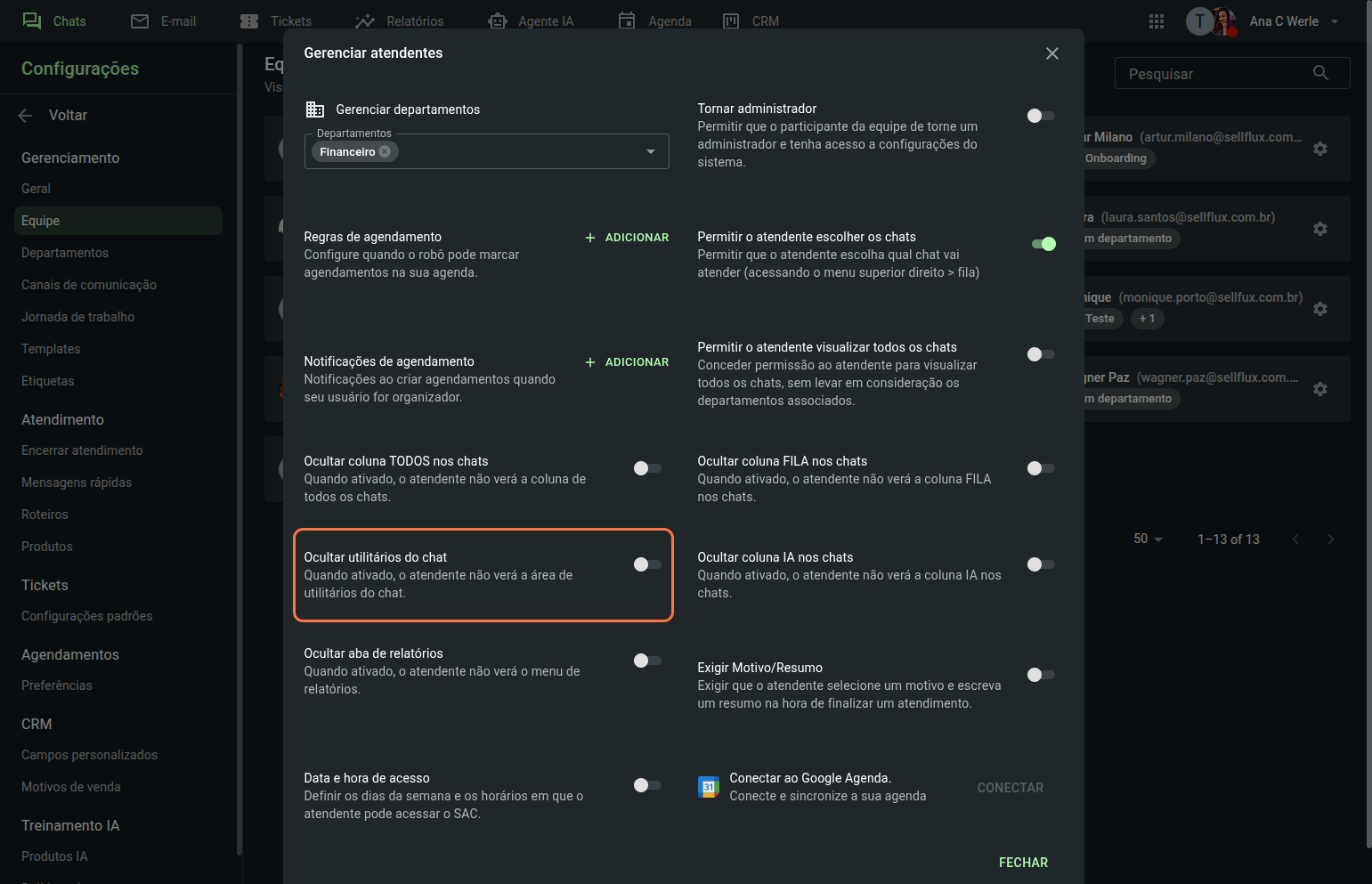 Também é possivel ocultar os utilitários do chat para esse atendente.