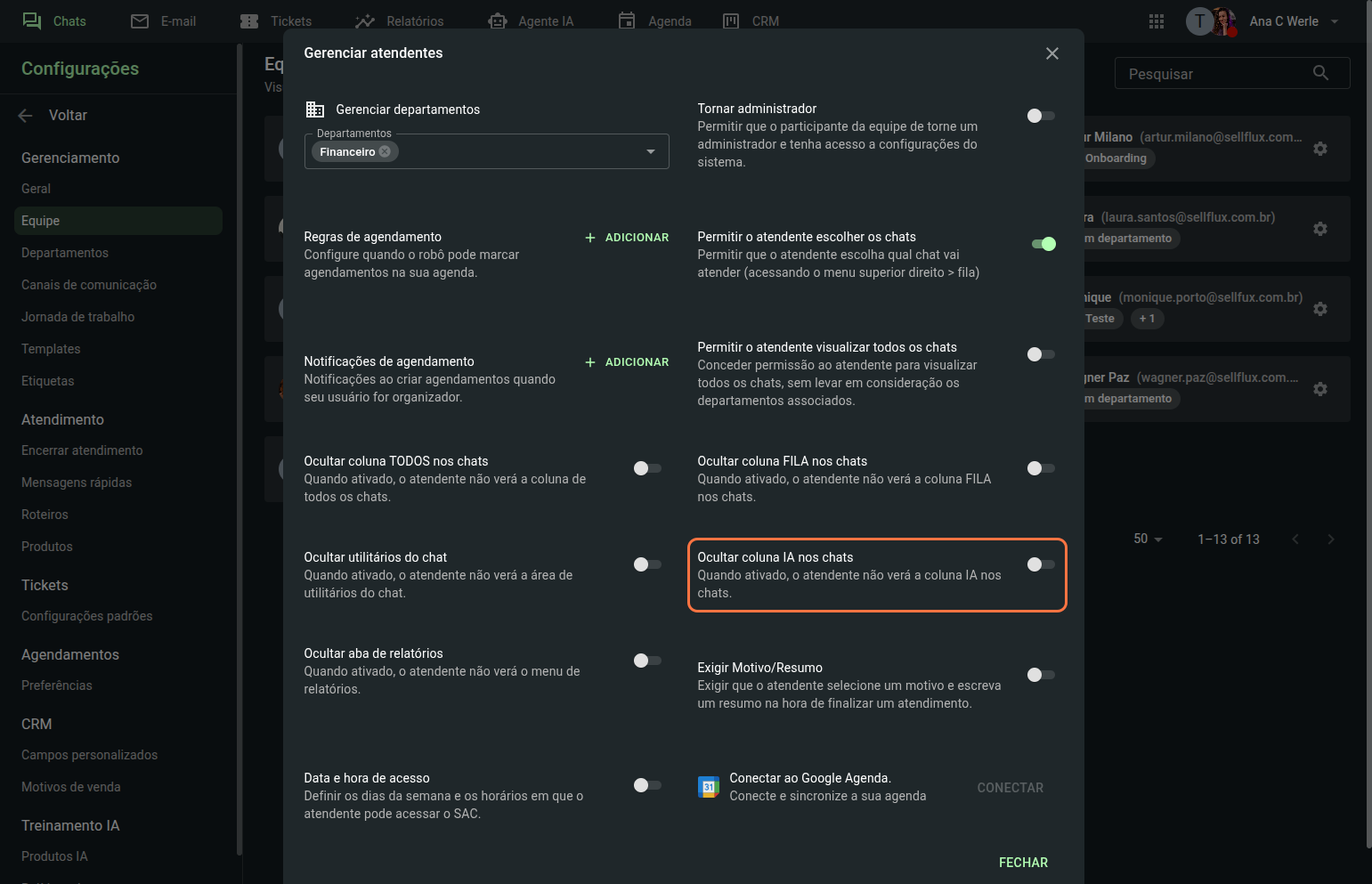 Ao ocultar a coluna IA, o atendente não terá acesso a essa coluna