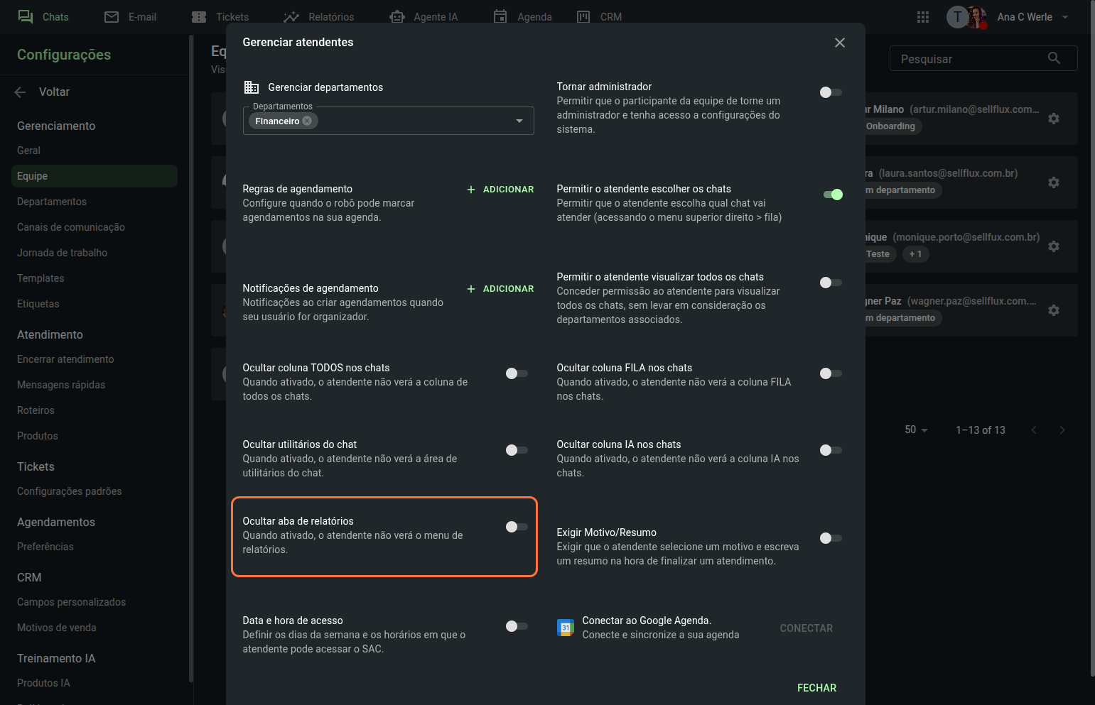 Também é possível remover o acesso do atendente a aba "relatórios"