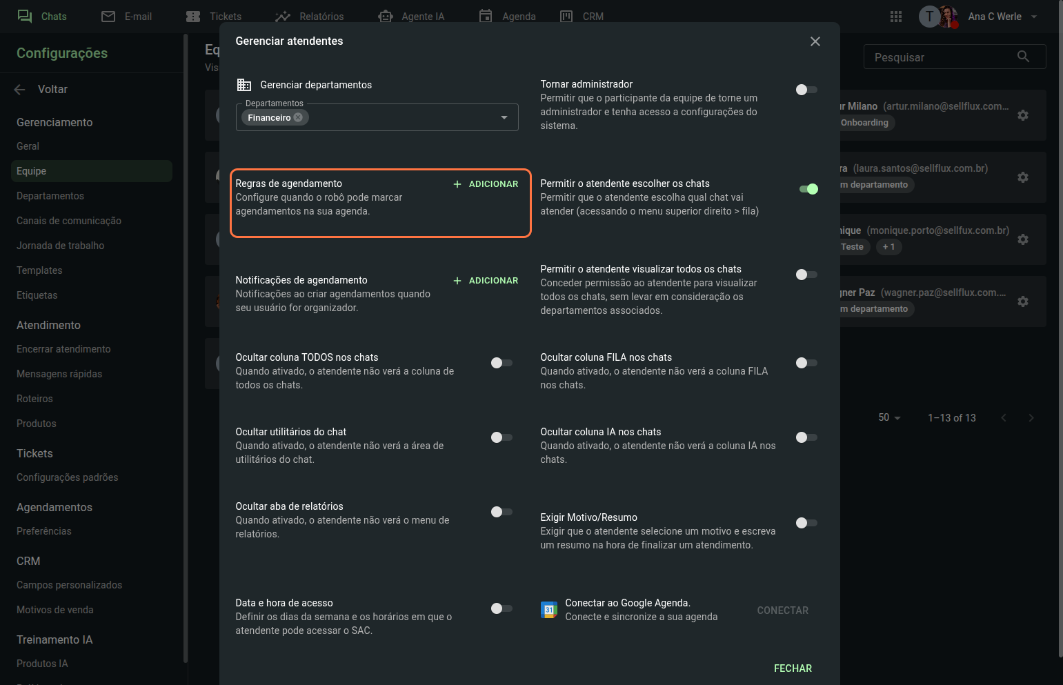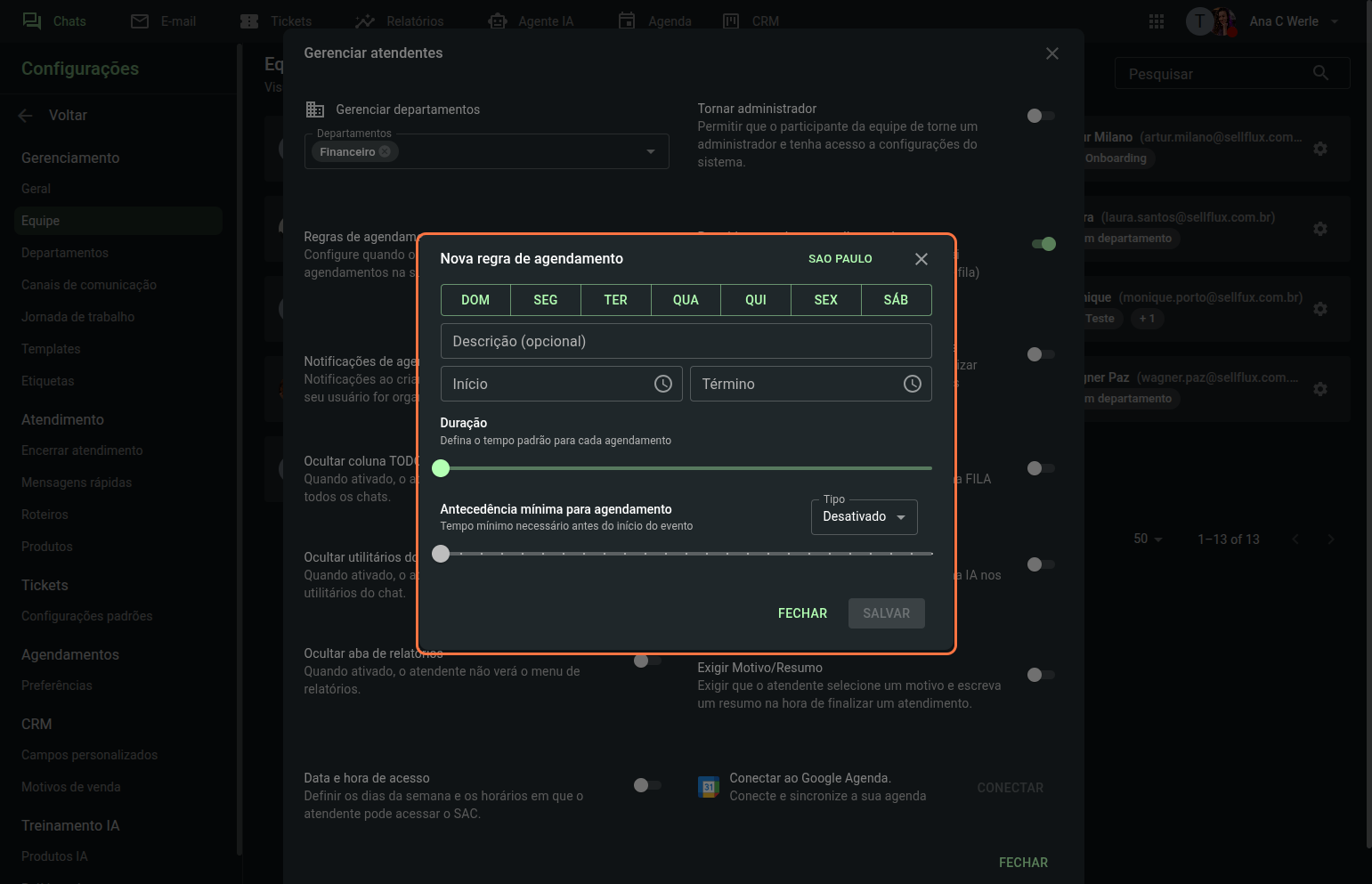 Também é possivel configurar regras de agendamento para esse atendente, essas regras serão utilizadas pela IA quando ela for agendar uma reunião. Assim ela visualiza os dias e horários que o atendente tem disponibilidade.