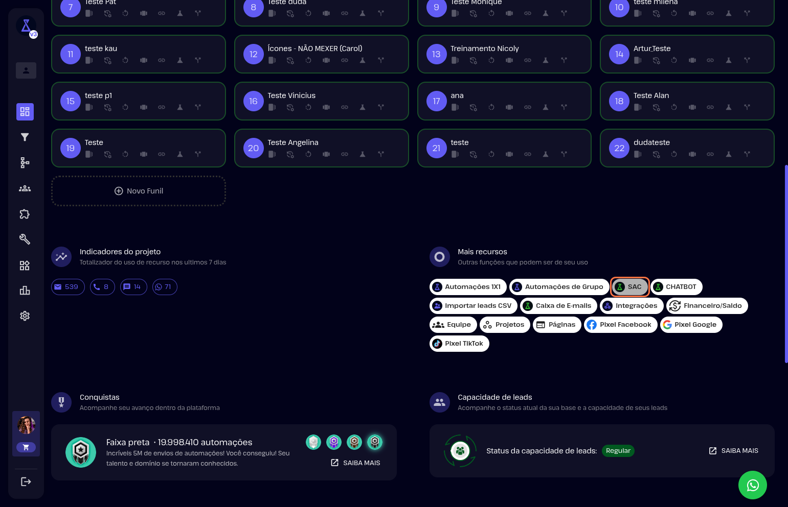 Para começar, acesse o Sellflux e no dashboard inicial localize a opção "Mais Recursos" e selecione o atalho "SAC".