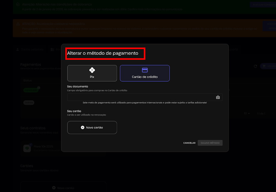 Você pode atualizar seu método de pagamento diretamente pela Central Financeira.