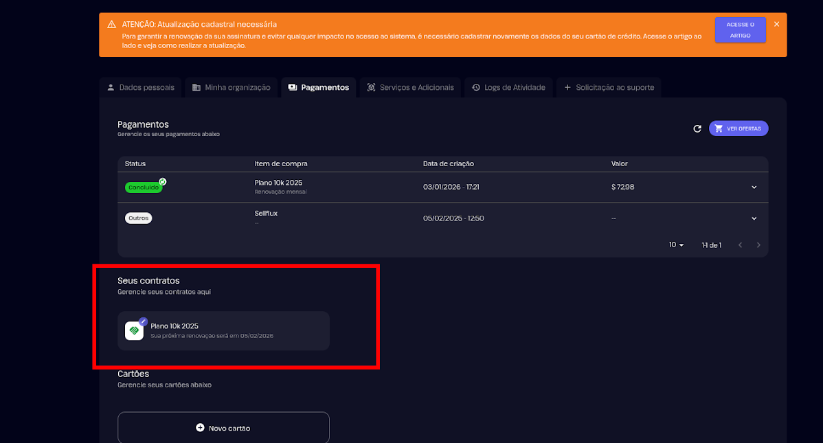 Com essas opções, a Central de Assinatura garante total autonomia para gerenciar seus dados financeiros dentro do SellFlux. Dessa forma, você mantém seus pagamentos sempre em dia, atualiza suas informações com facilidade e acompanha tudo em um único lugar — de forma simples, prática e segura.