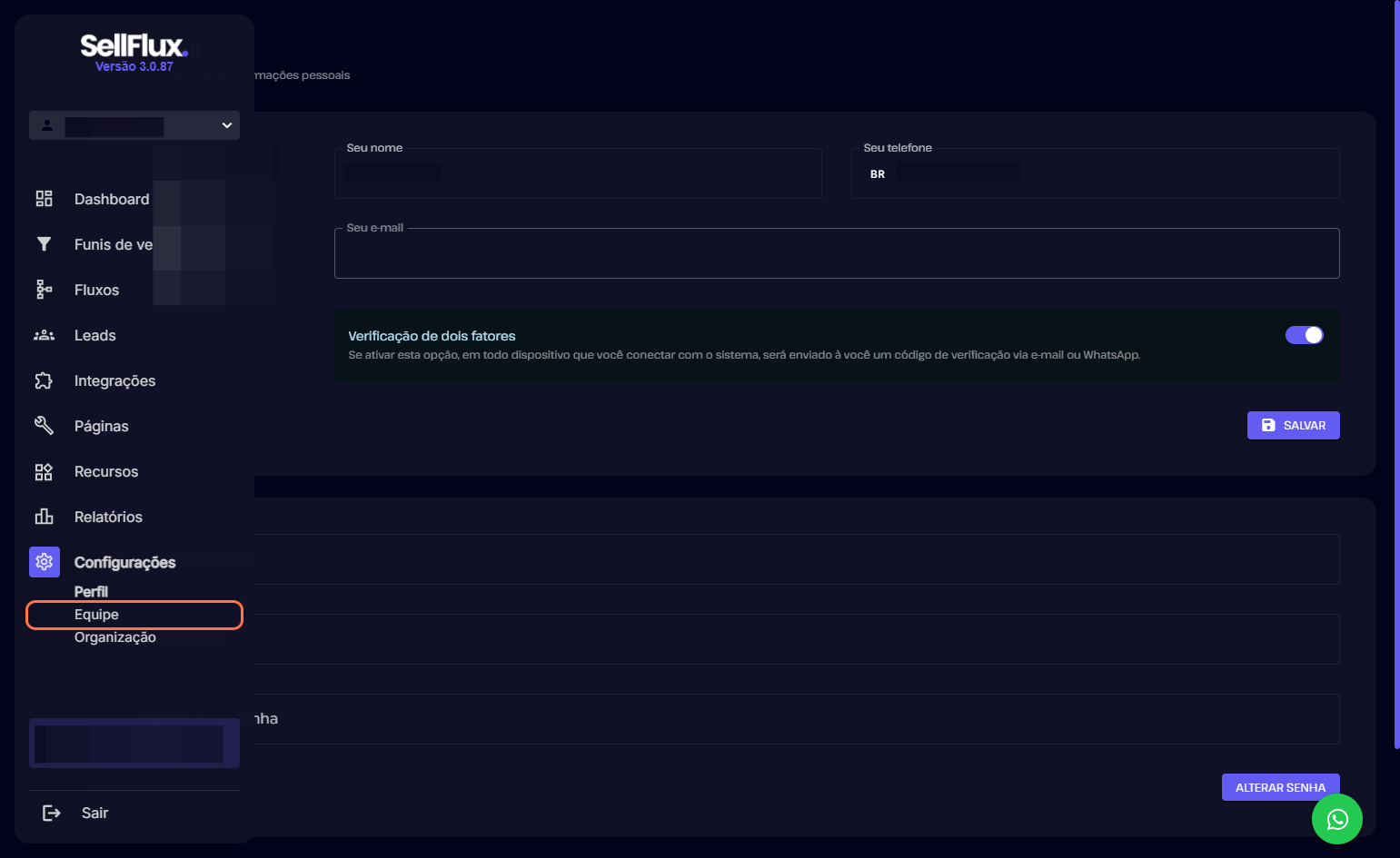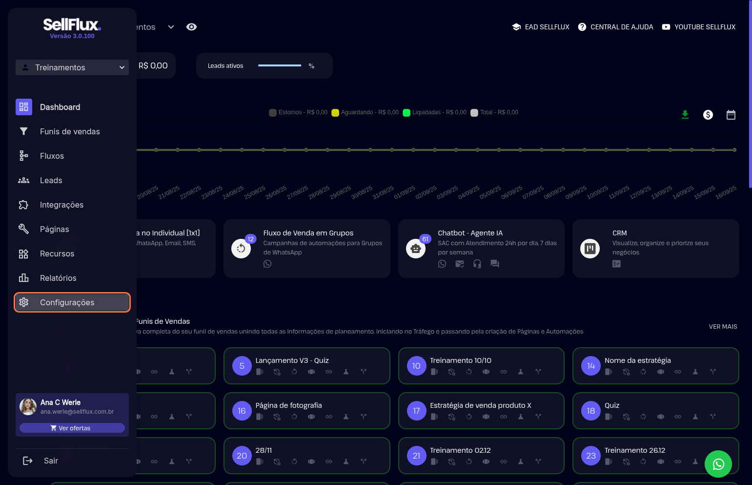 1- Acesse o Sellflux e no menu lateral, e selecione "Configurações".
