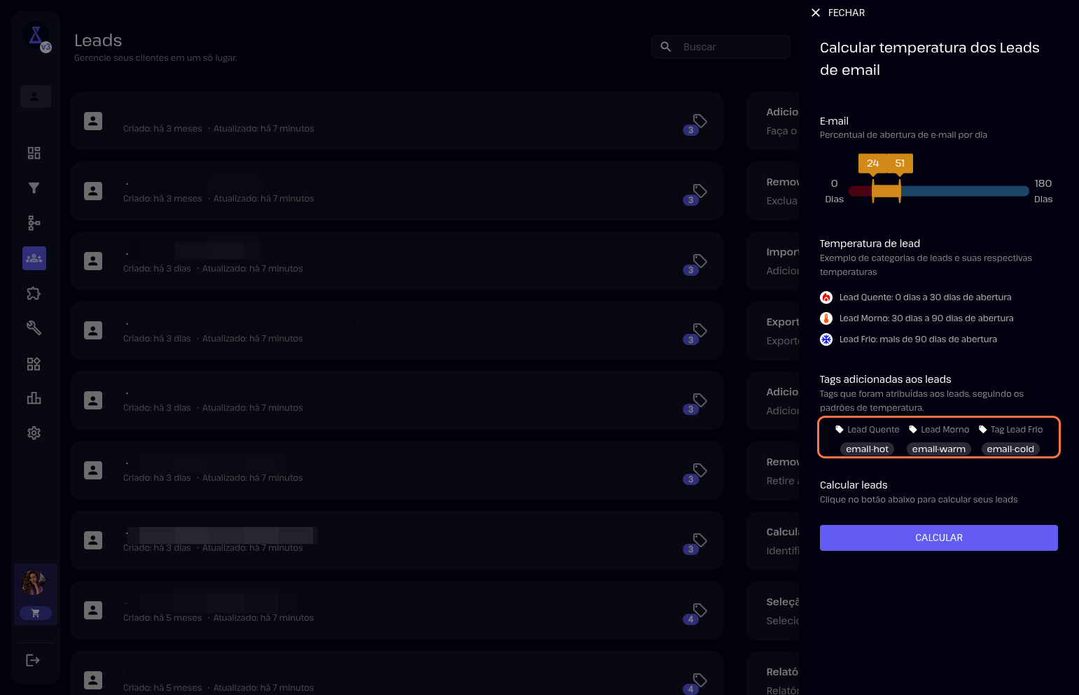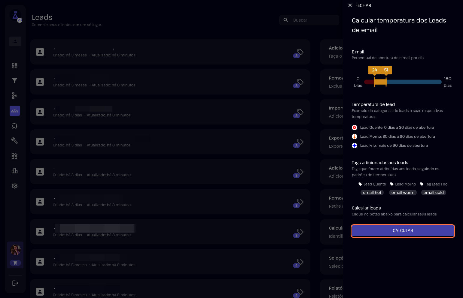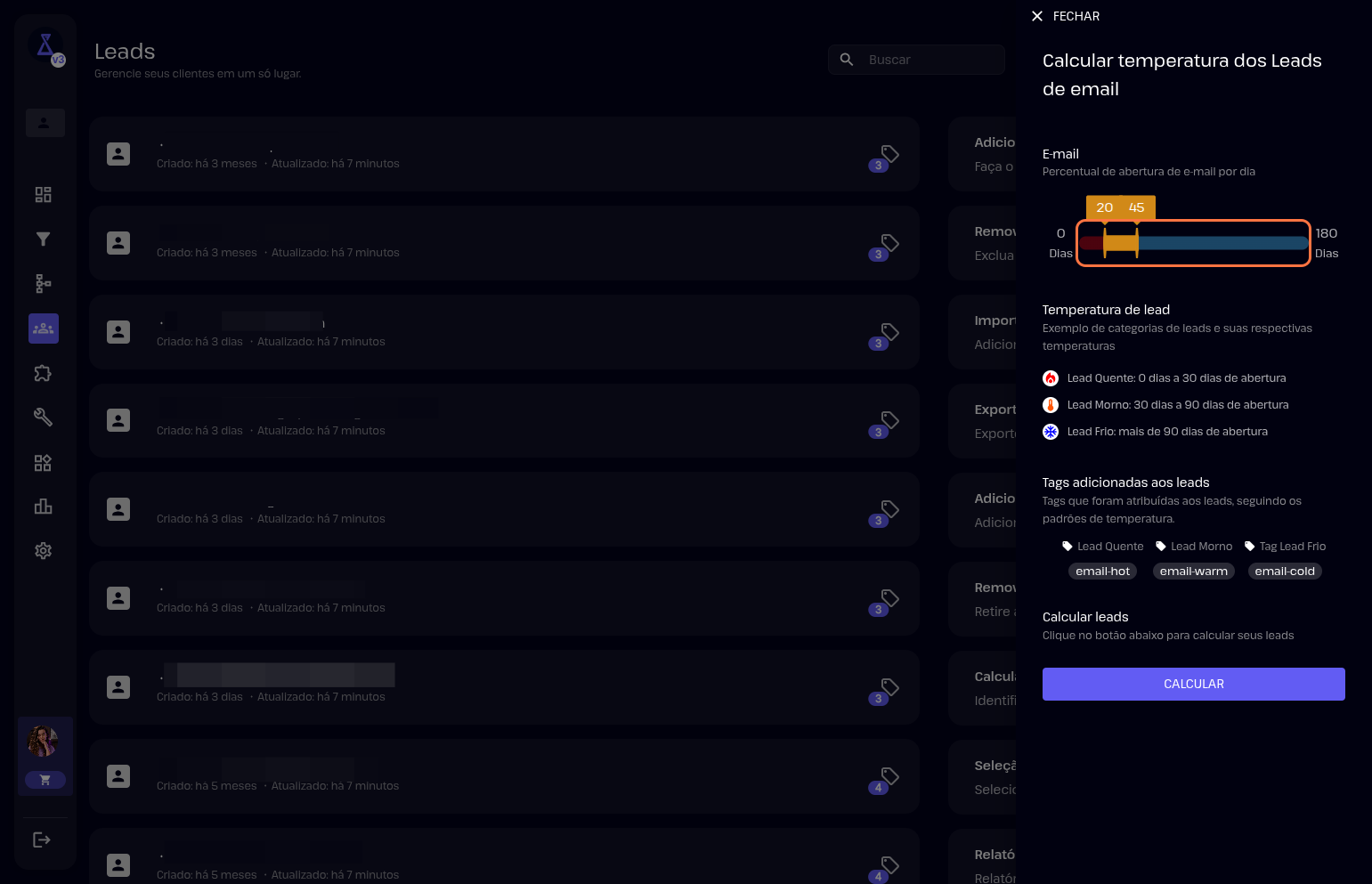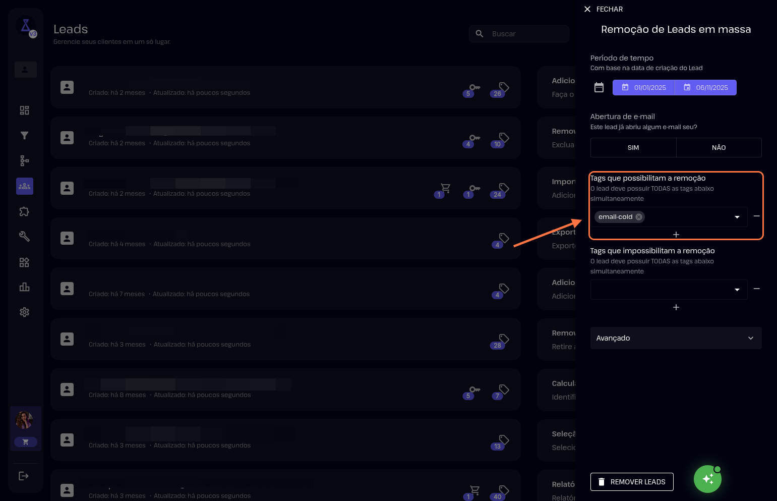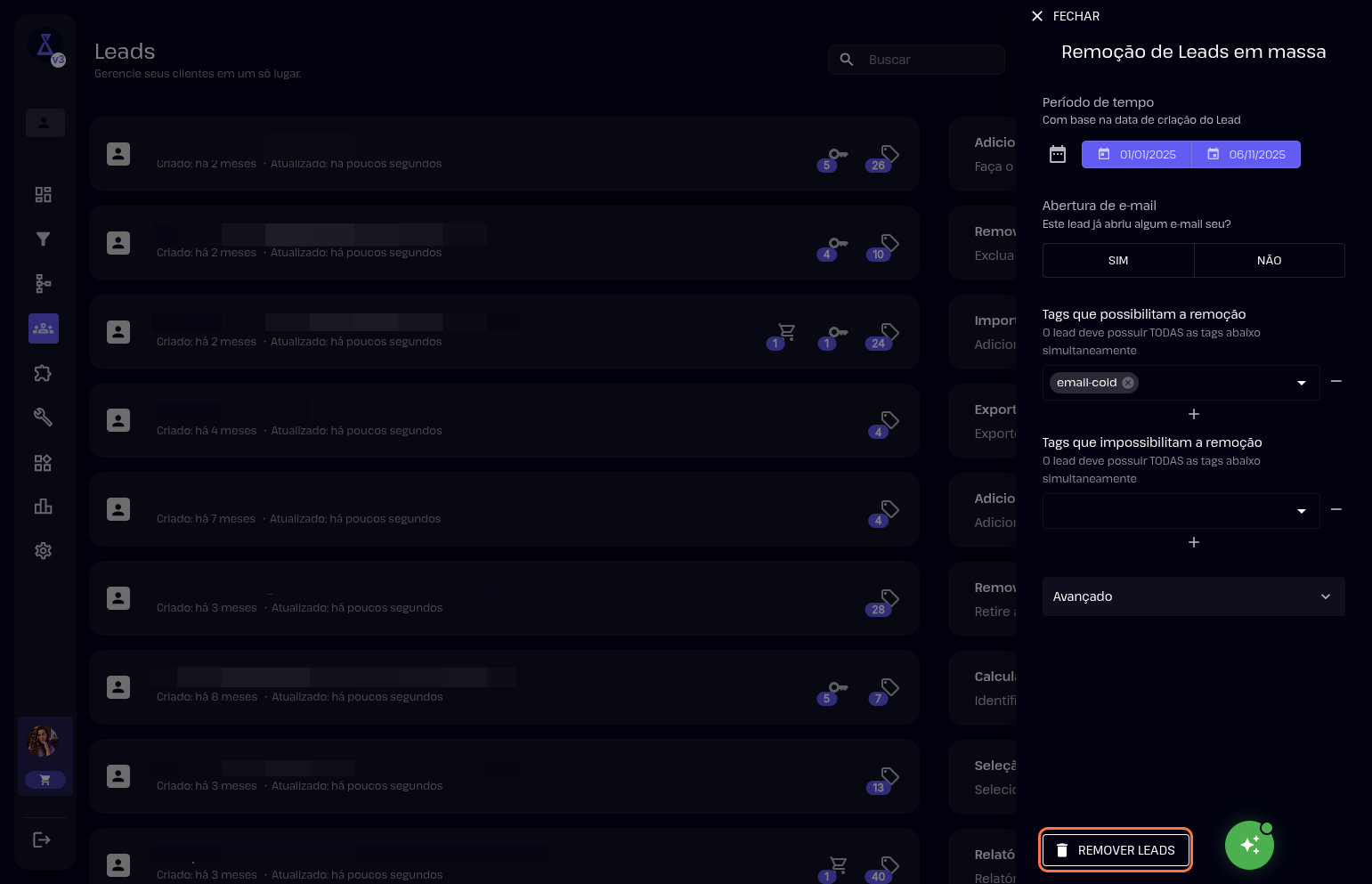 - Para excluir leads com base em sua temperatura, clique em "remover leads".