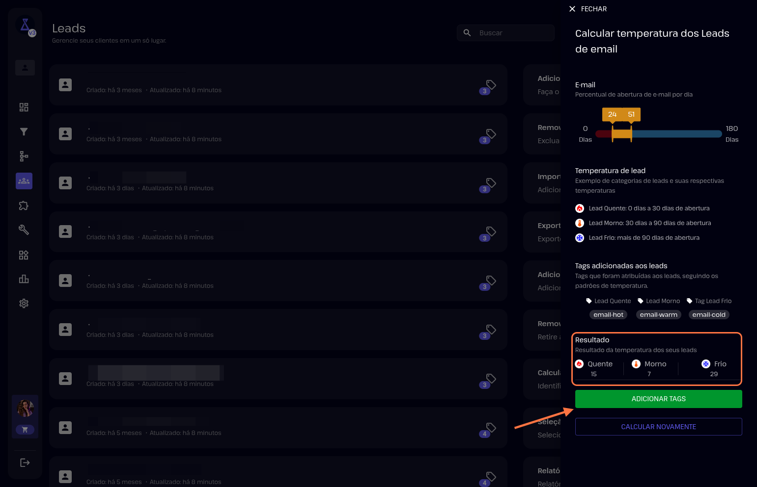 6. Será exibido o resultado do cálculo, com a quantidade de leads quentes, mornos e frios. Para aplicar as tags nos leads clique no botão "Adicionar tags".