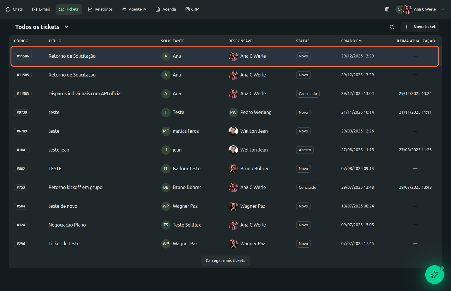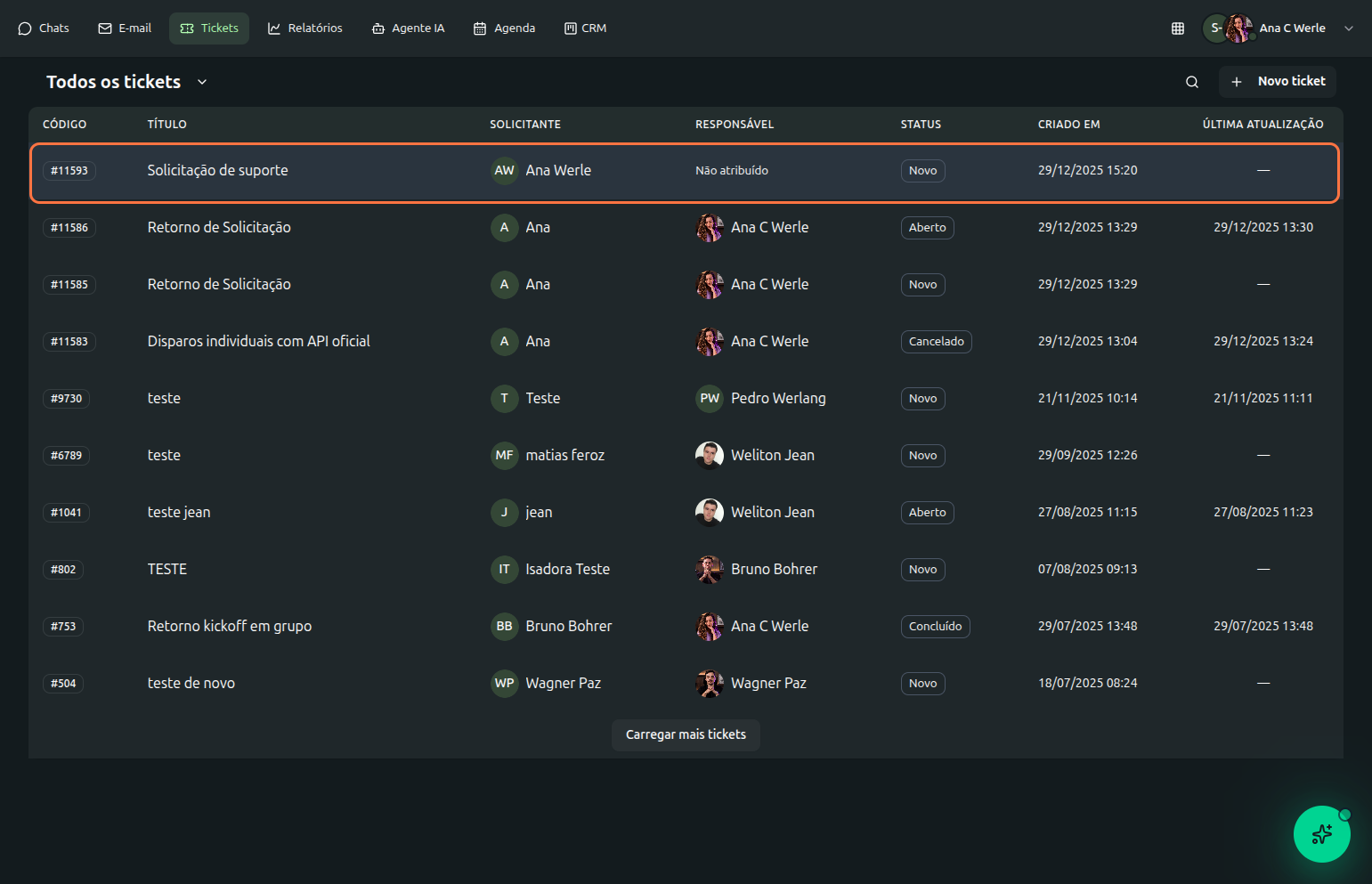 12- Com isso, ele será exibido na tela inicial de tickets já criado com as configurações feitas anteriormente. Para visualizá-lo detalhadamente, basta clicar sobre o mesmo.