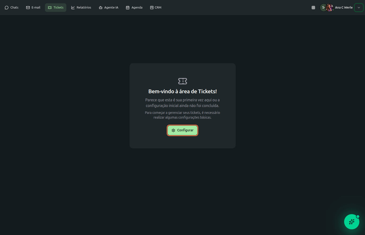 1- Na plataforma SAC, acesse a aba "Tickets". Para começar a configurar, é necessário clicar no botão "Configurar".