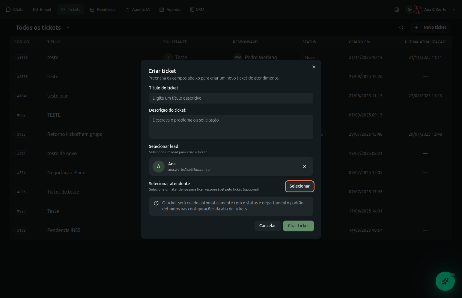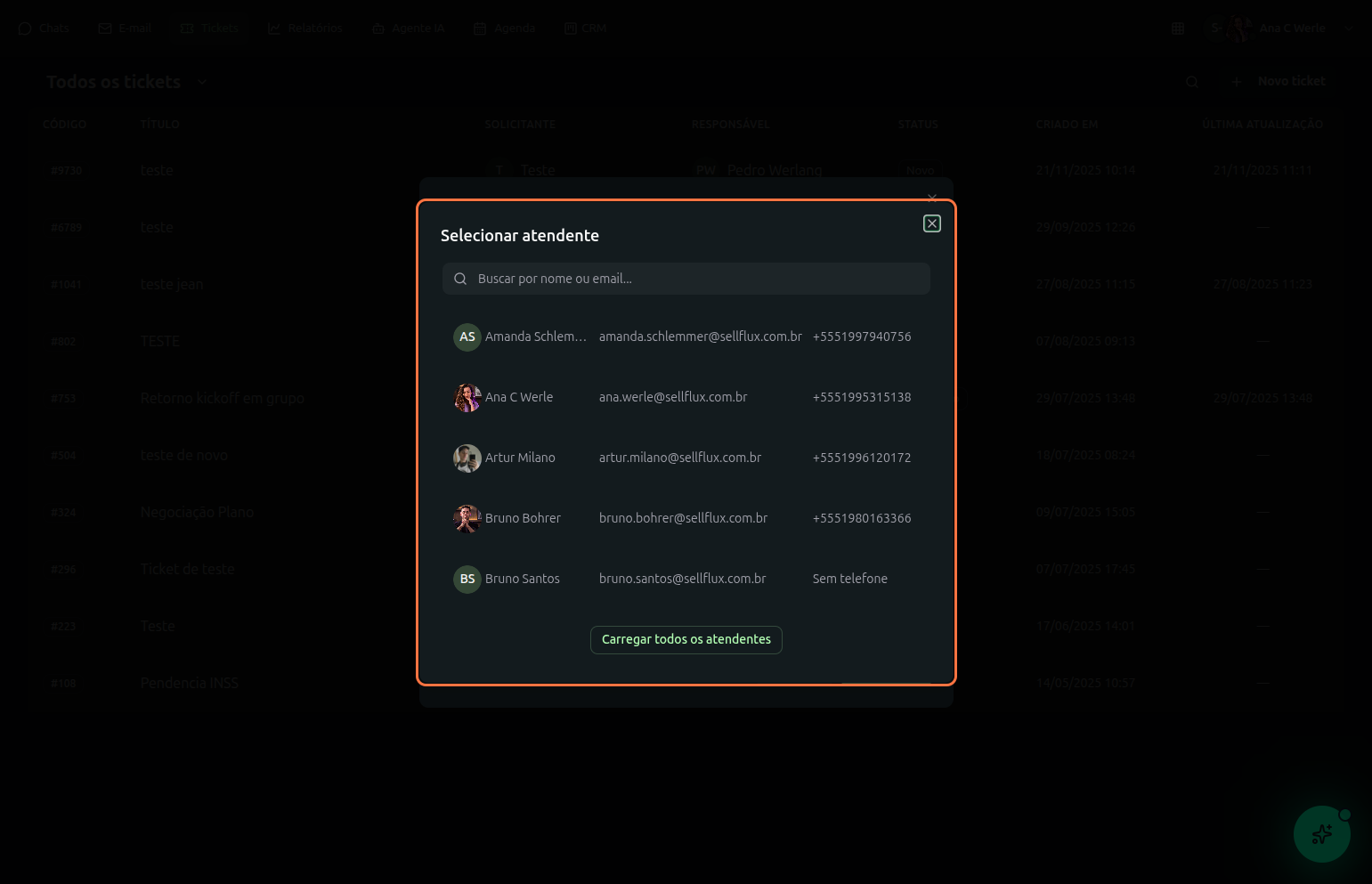 10- Ao realizar a atribuição, será exibido um modal para selecionar o atendente que será responsável pelo ticket. Basta clicar sobre o atendente desejado.