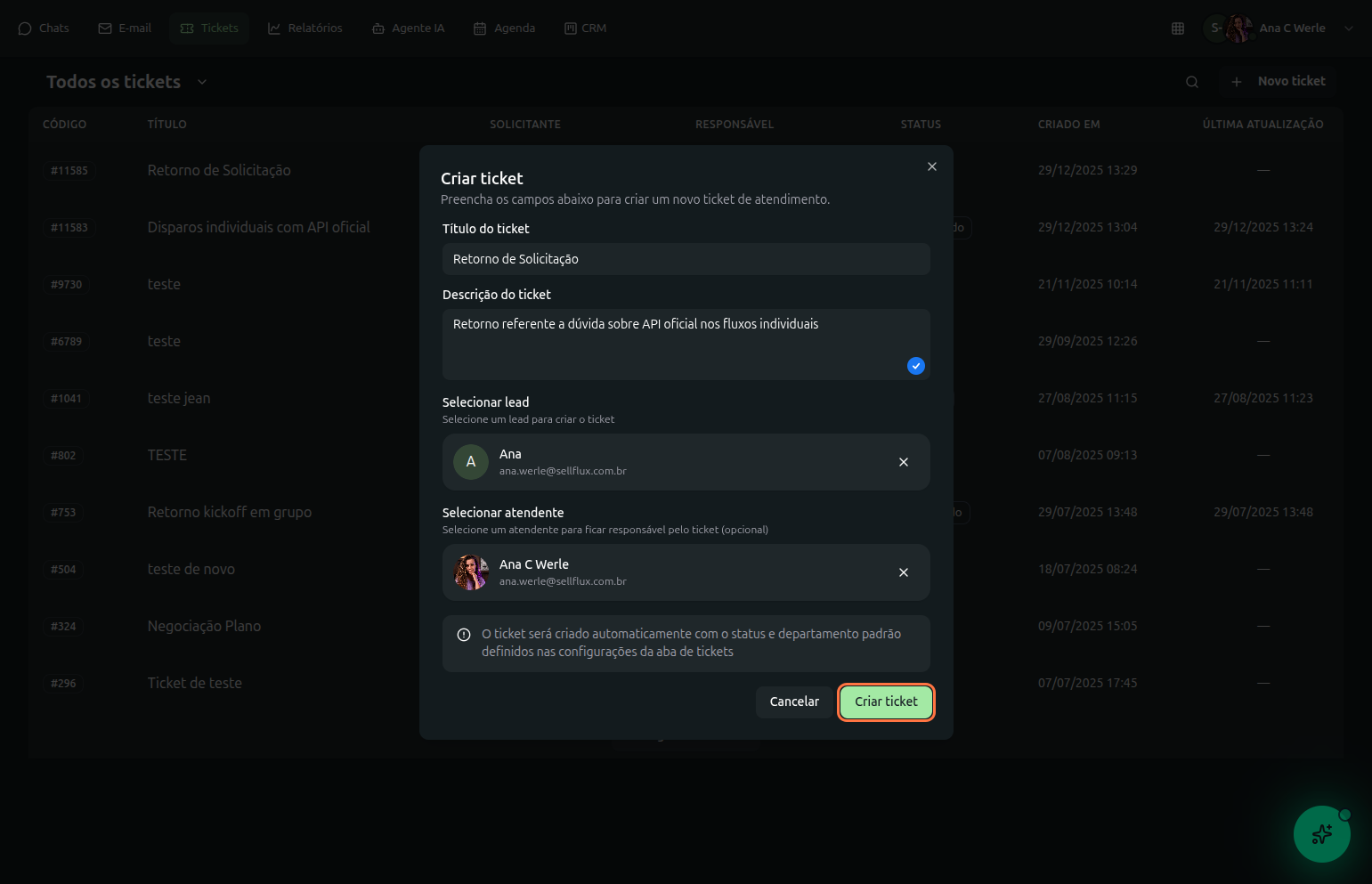 Pronto! Com isso, você concluiu a configuração da área de Tickets do SellFlux e já pode realizar seus atendimentos por e-mail.