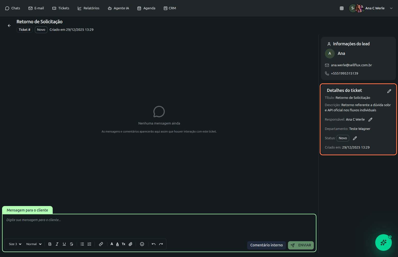 13- Aqui é possível verificar as informações do lead para o qual foi aberto o ticket, também sendo possível editá-las.