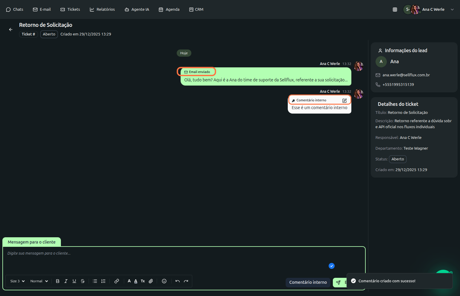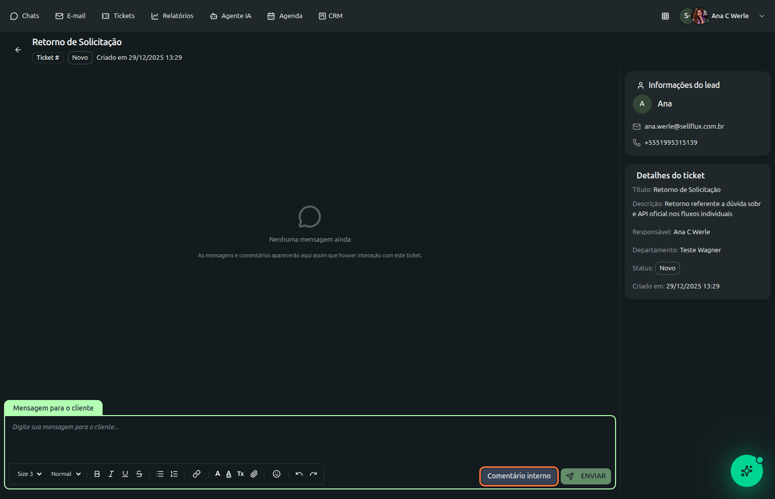 16- Também é possível adicionar um comentário interno ao ticket, esse comentário não é enviado ao cliente.