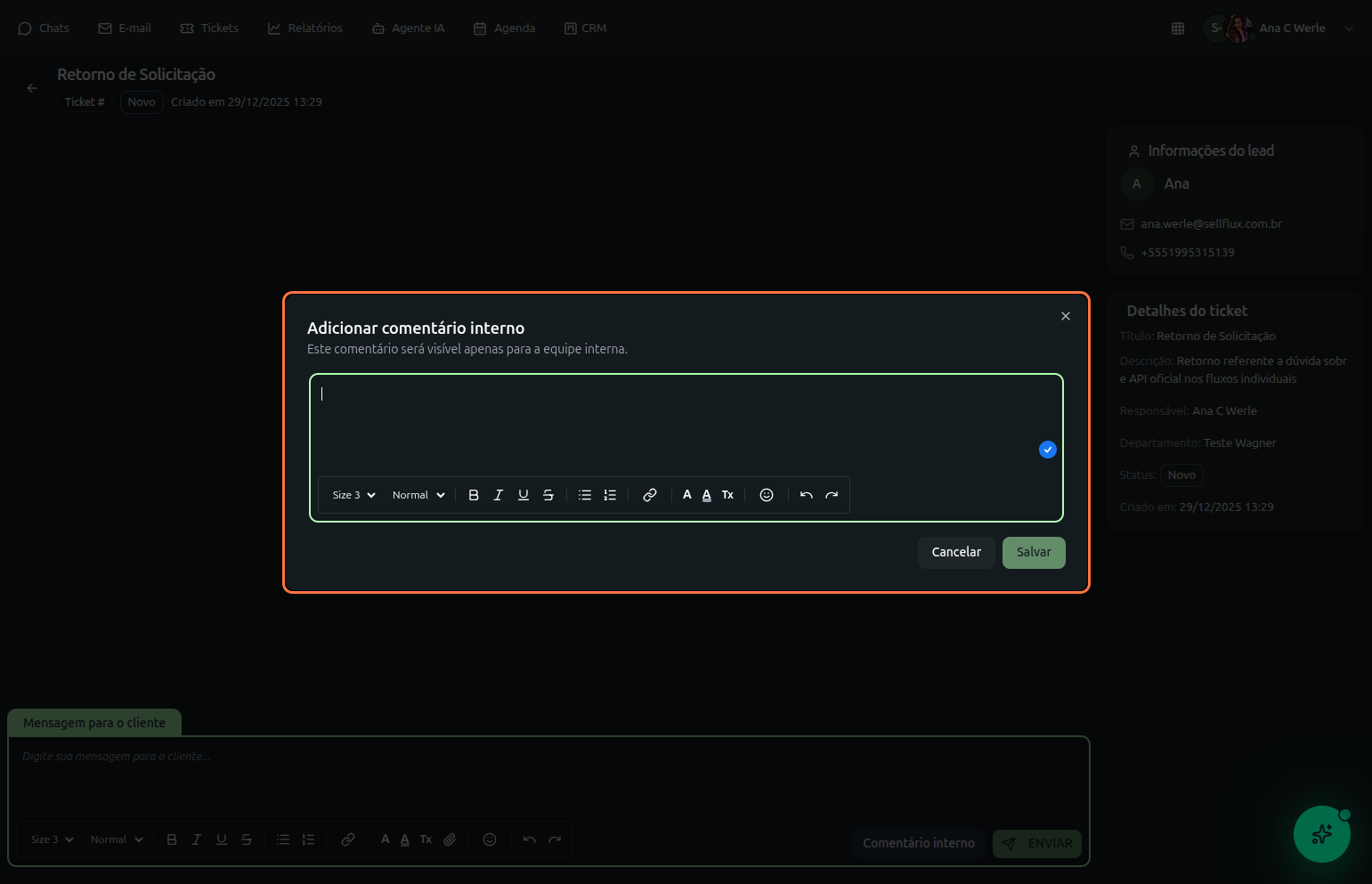 17- Ao clicar para adicionar um comentário interno, é aberto um modal com opções de edição de texto, como os do campo "mensagem para o cliente".