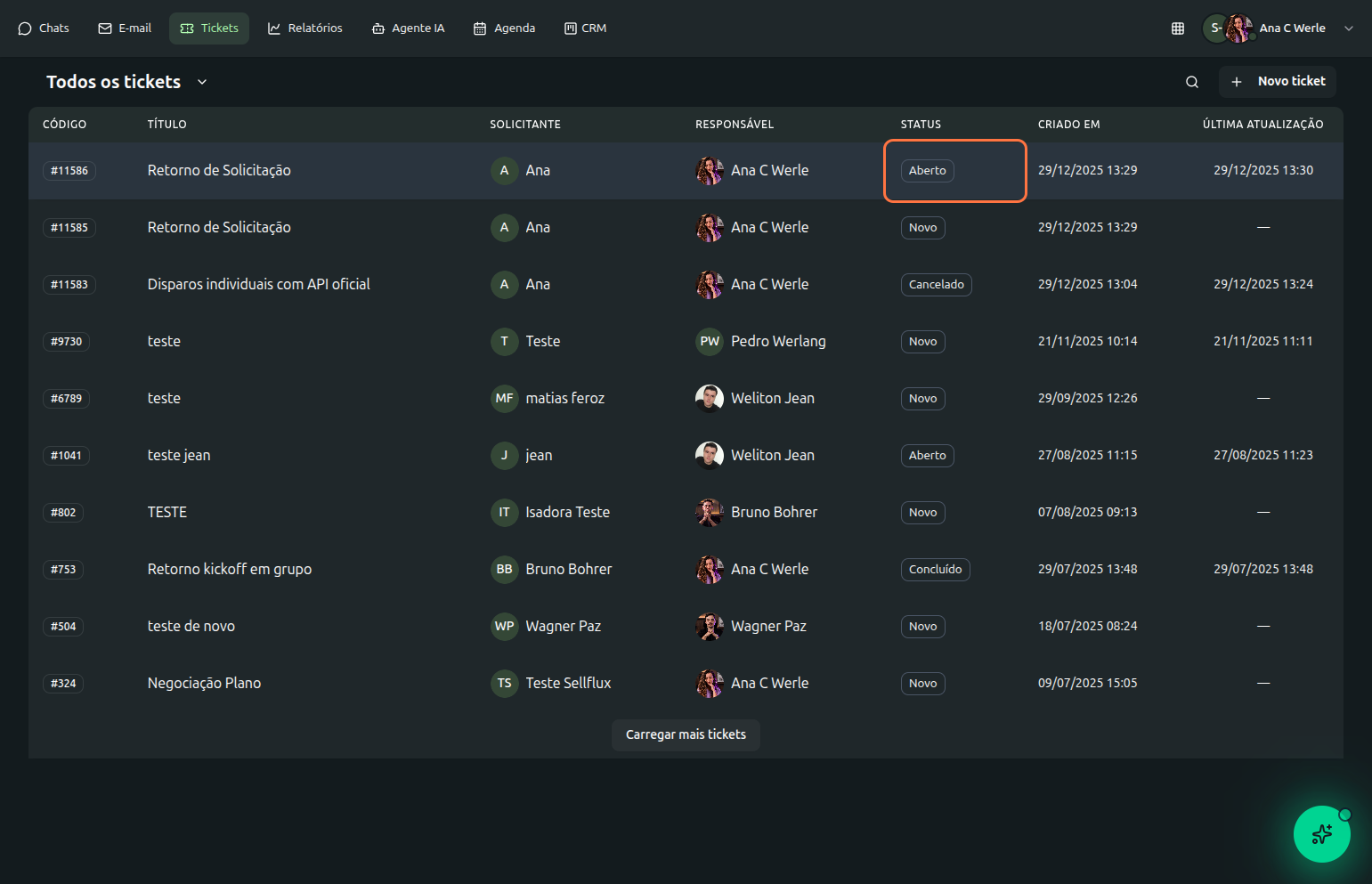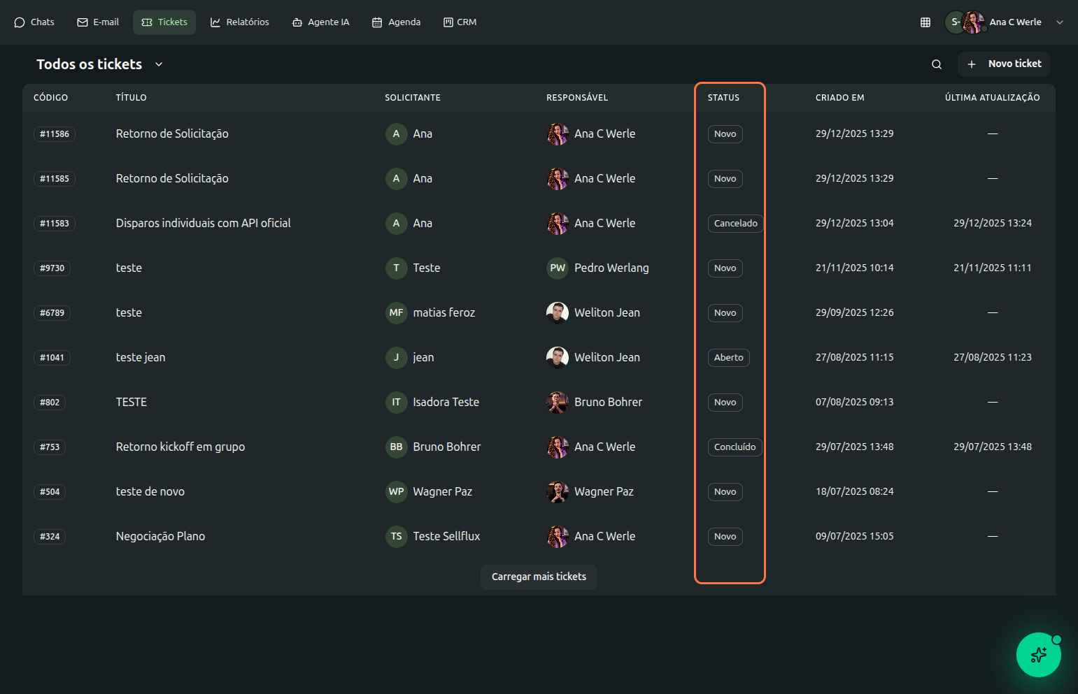 19- O status dos tickets é exibido na tela inicial dos tickets, na coluna "Status".
