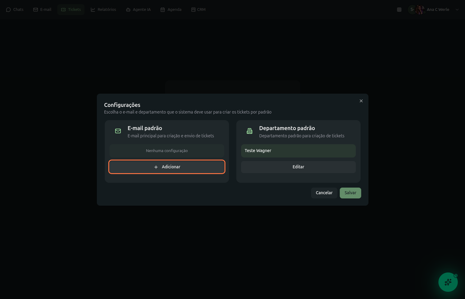 2- O primeiro passo é configurar o e-mail padrão, que será utilizado tanto para a criação quanto para o envio dos tickets. Clique em "Adicionar" para selecionar a sua caixa postal padrão.