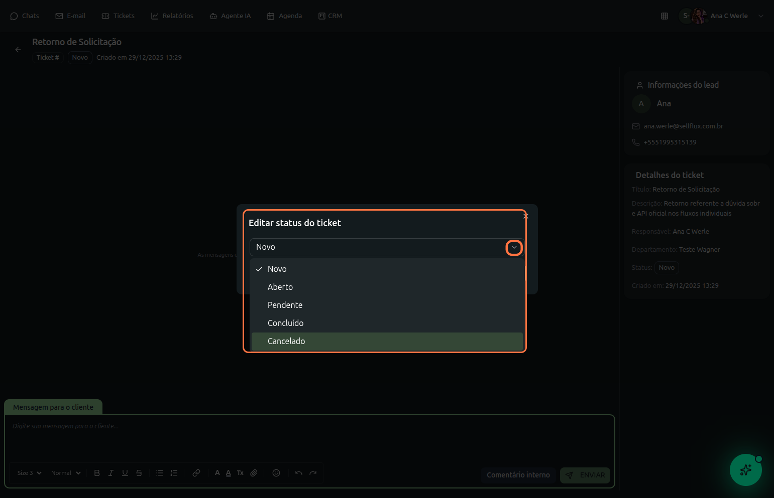 21- Nesse modal então será possível alterar o status do ticket para a opção desejada, como Novo, Aberto, entre outros disponíveis no sistema.