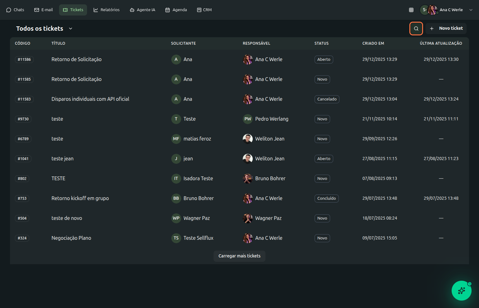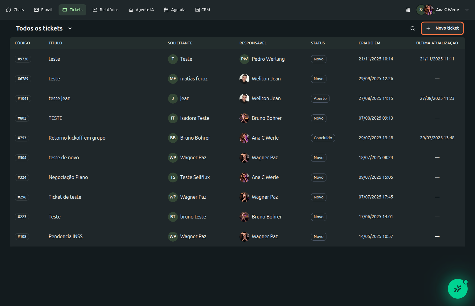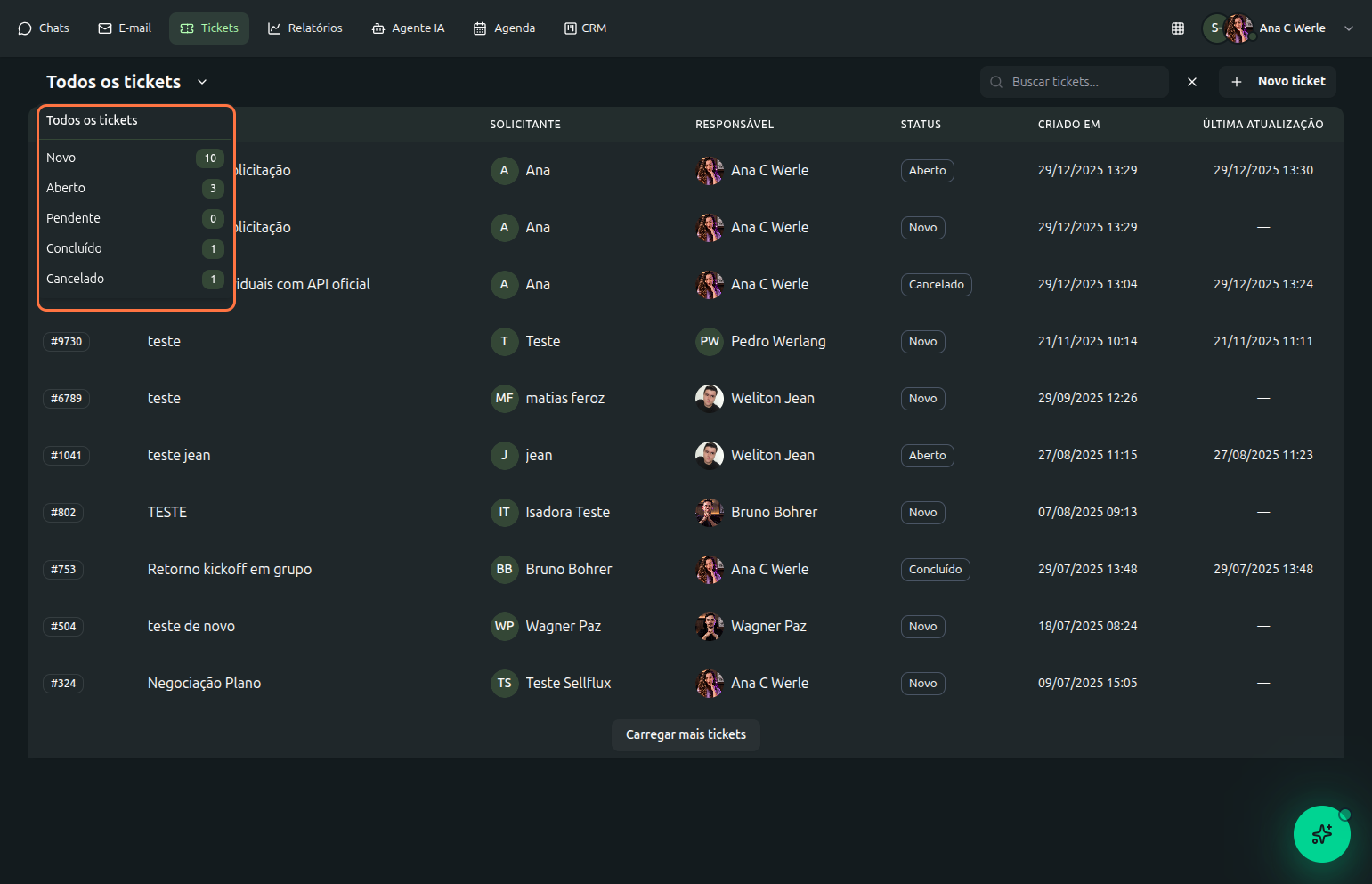23- Na tela inicial da área de tickets, é possível visualizar todos os tickets criados, e também filtrar por status, para facilitar a visualização.