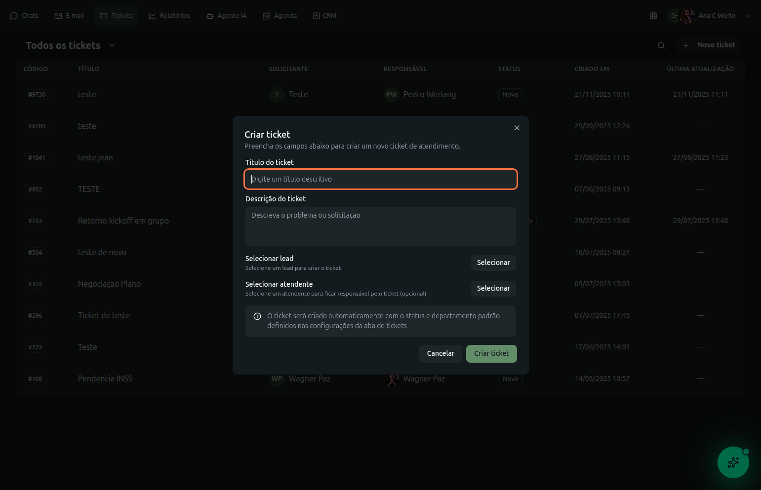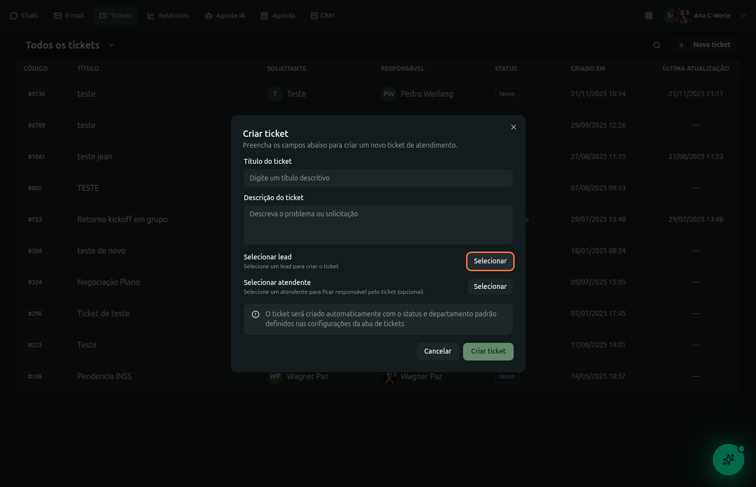 8- Vincule um lead ao ticket para associar o ticket ao cliente correspondente e permitir sua criação corretamente.