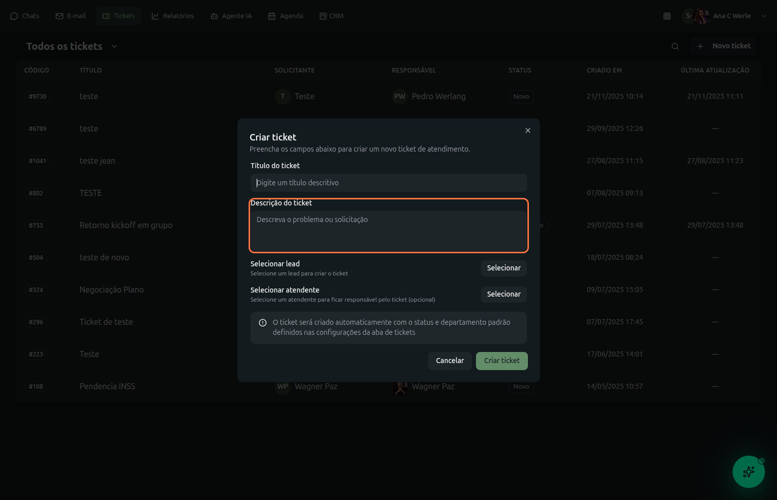 9- Também é possível atribuir um atendente responsável por esse ticket.